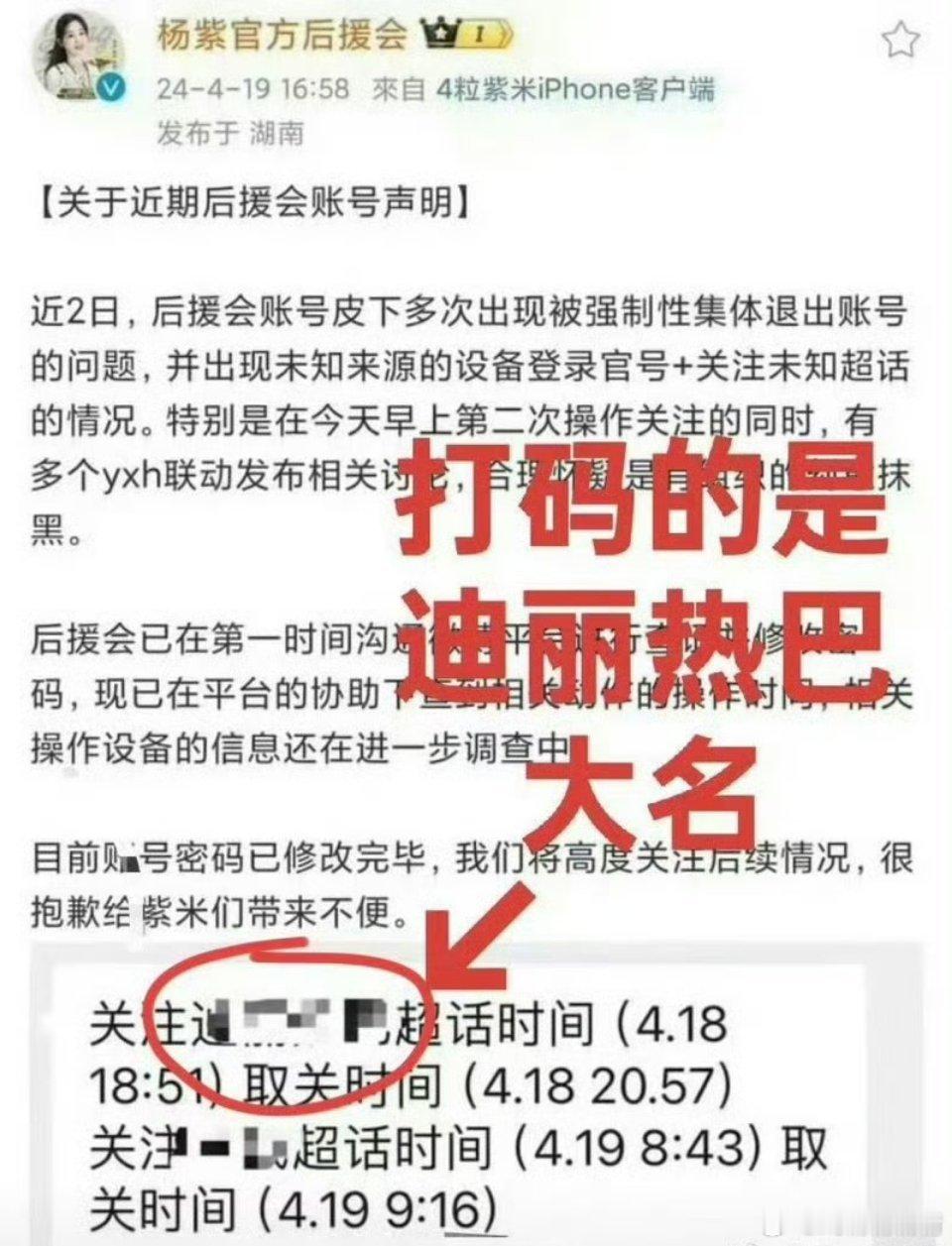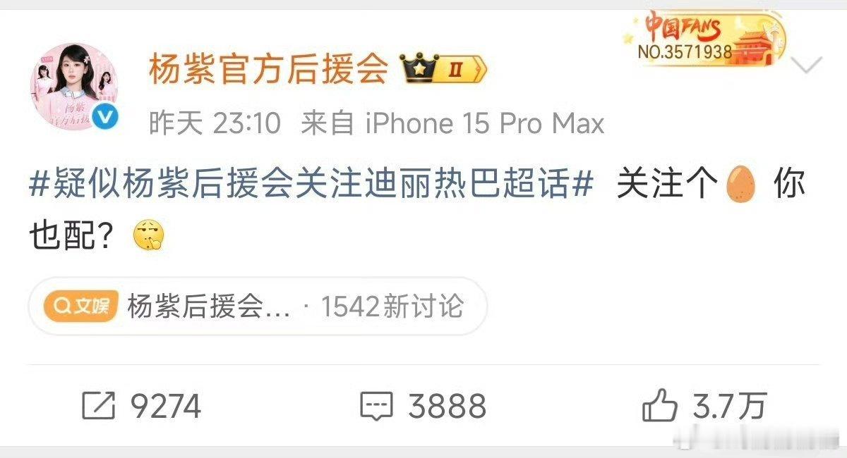 杨紫后援会集体辞职解散重组疑似后援会关注了迪丽热巴,随后回应关注了个蛋,现在巴粉