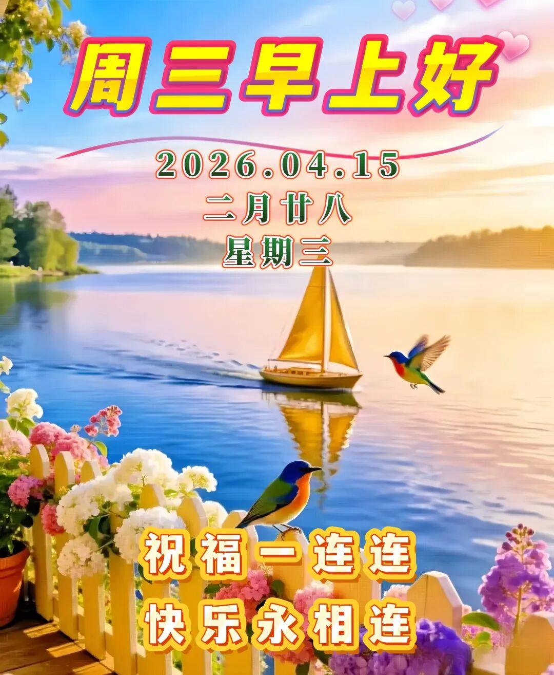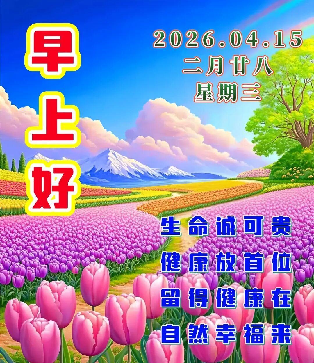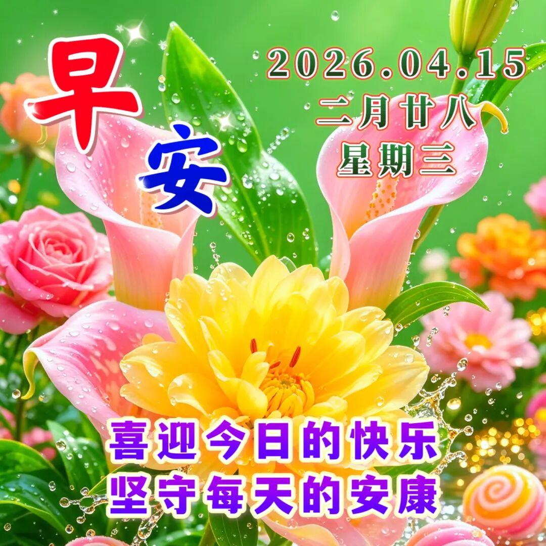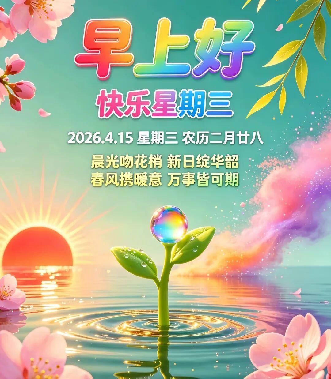 🌅今天是4月15日,🍀充满希望的早晨,💖守护宝贵的健康,🌊品味生活的甘甜,💐共享明媚的阳光;🌞愿我们的生活始终洋溢着平安、🌷快乐与幸福。周三早上好!🌈