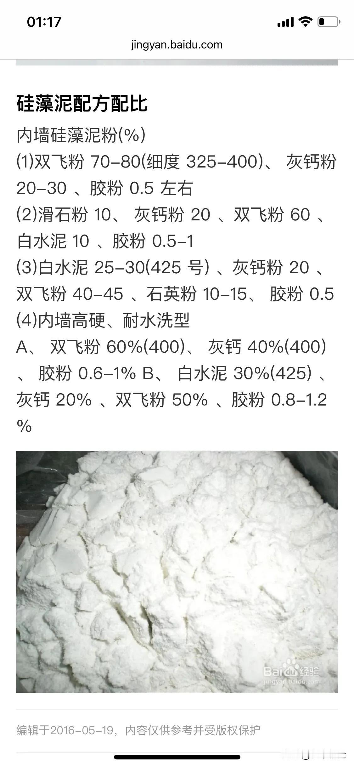 无意中搜索到了硅藻泥的配方,不知道是否正确,完整截图如下,希望对大家有所帮助吧!好像挺高级的样子[大笑],我使用体感就是双飞粉+胶粉+助剂……塑形的话,加稻草,石英砂等等……原谅我不是专业人士,我只是装修一枚,所以我觉得也只是我觉得,看看笑笑就过去了,不用和我较真哈![大笑]