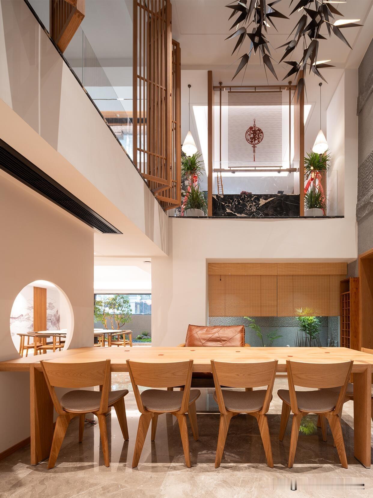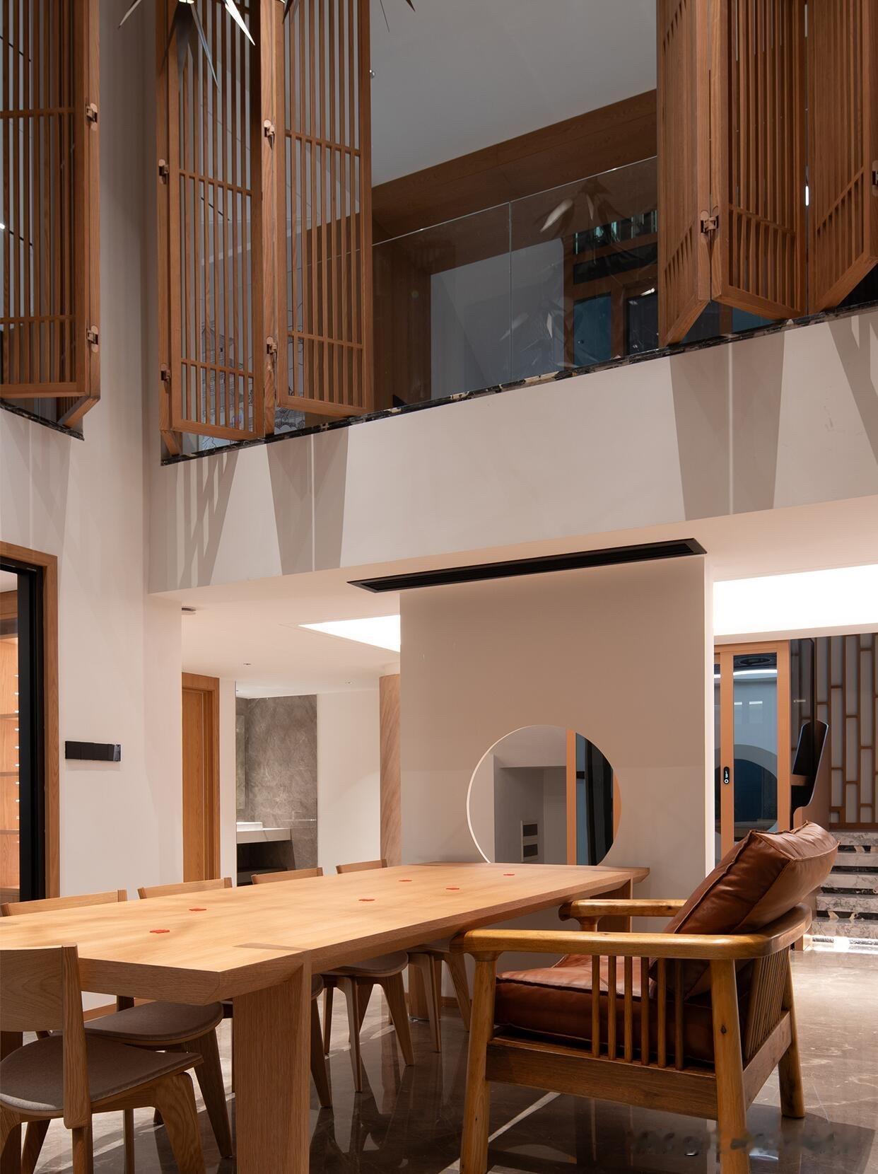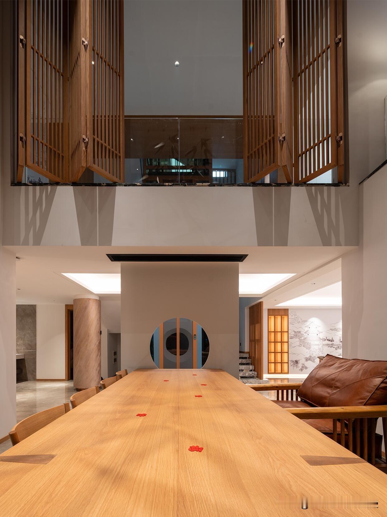 4️⃣家具选型: 茶台一定要大!长条原木茶台,能压住挑空的空旷感,让空间更稳重。