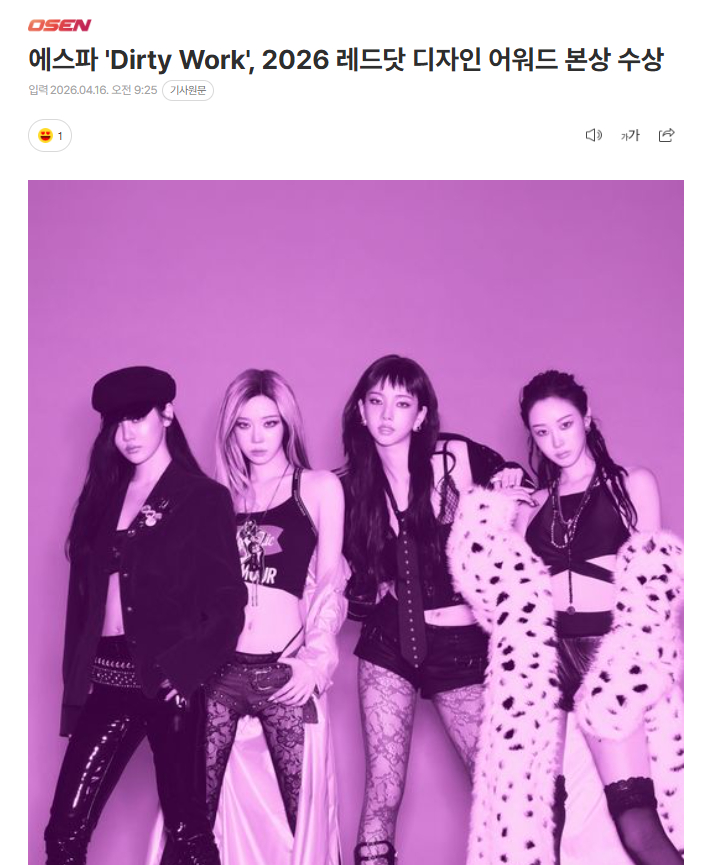 16日据SM方面透露,aespa单曲《Dirty Work》在世界三大设计奖之一的“红点设计大奖”中获得了产品设计部门本赏(Red Dot)。