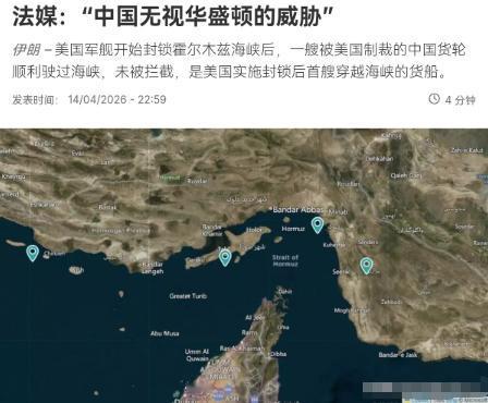法媒表示,毫无疑问,中国无视了华盛顿的威胁!在中国油轮“富星”号通过霍尔木兹海峡之后,4月15日,法新社刊文表示,美国军舰开始封锁霍尔木兹海峡后,一艘被美国制裁的中国货轮顺利驶过海峡,未被拦截,这是美国实施封锁后首艘穿越海峡的货船,而与此同时,他国另外六艘油轮试图通过霍尔木兹海峡,在美军舰的封锁下折返。