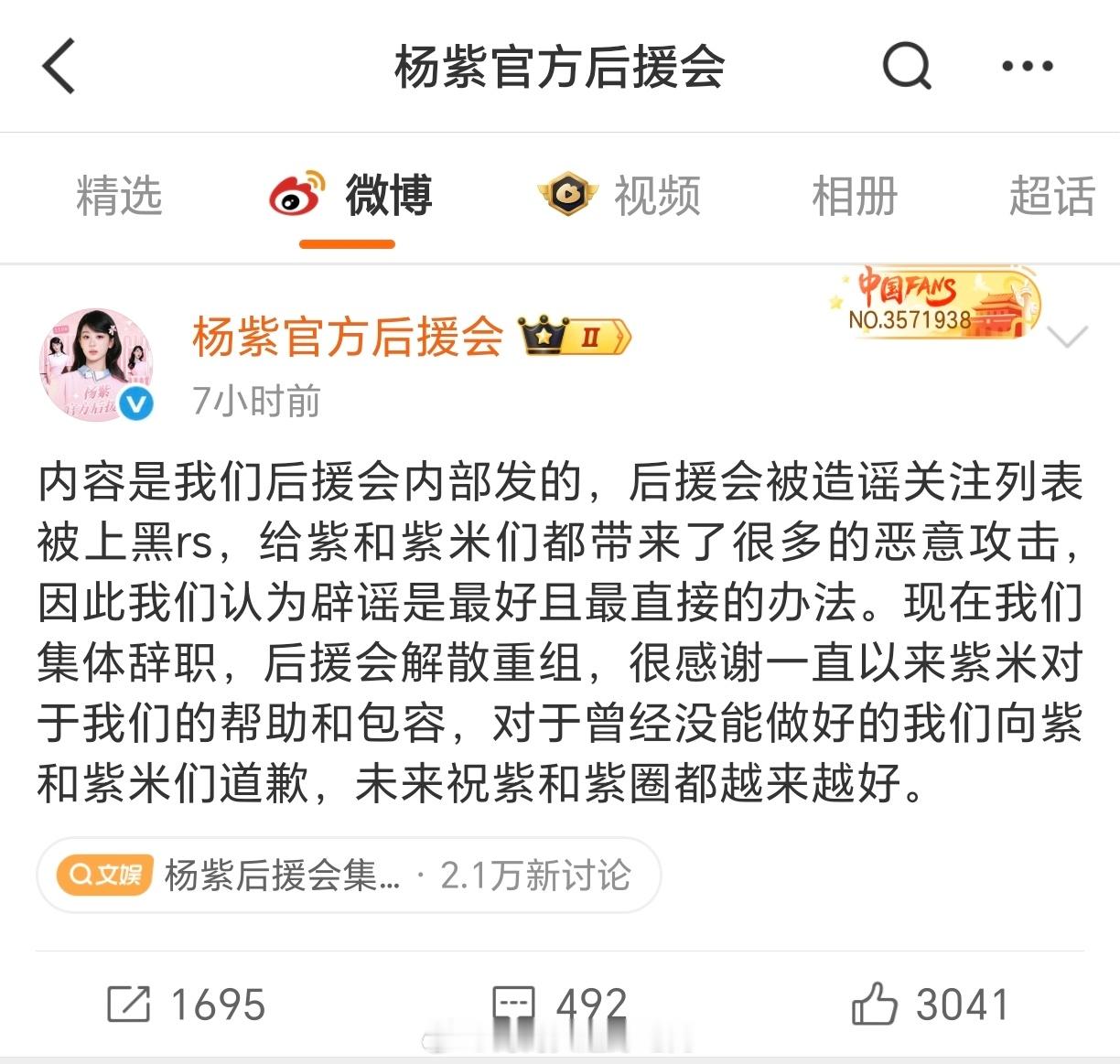 杨紫官方后援会发文:关注列表是被造谣的,给紫米带来很多恶意攻击,现后援会集体辞职解散重组,向杨紫和紫米道歉。