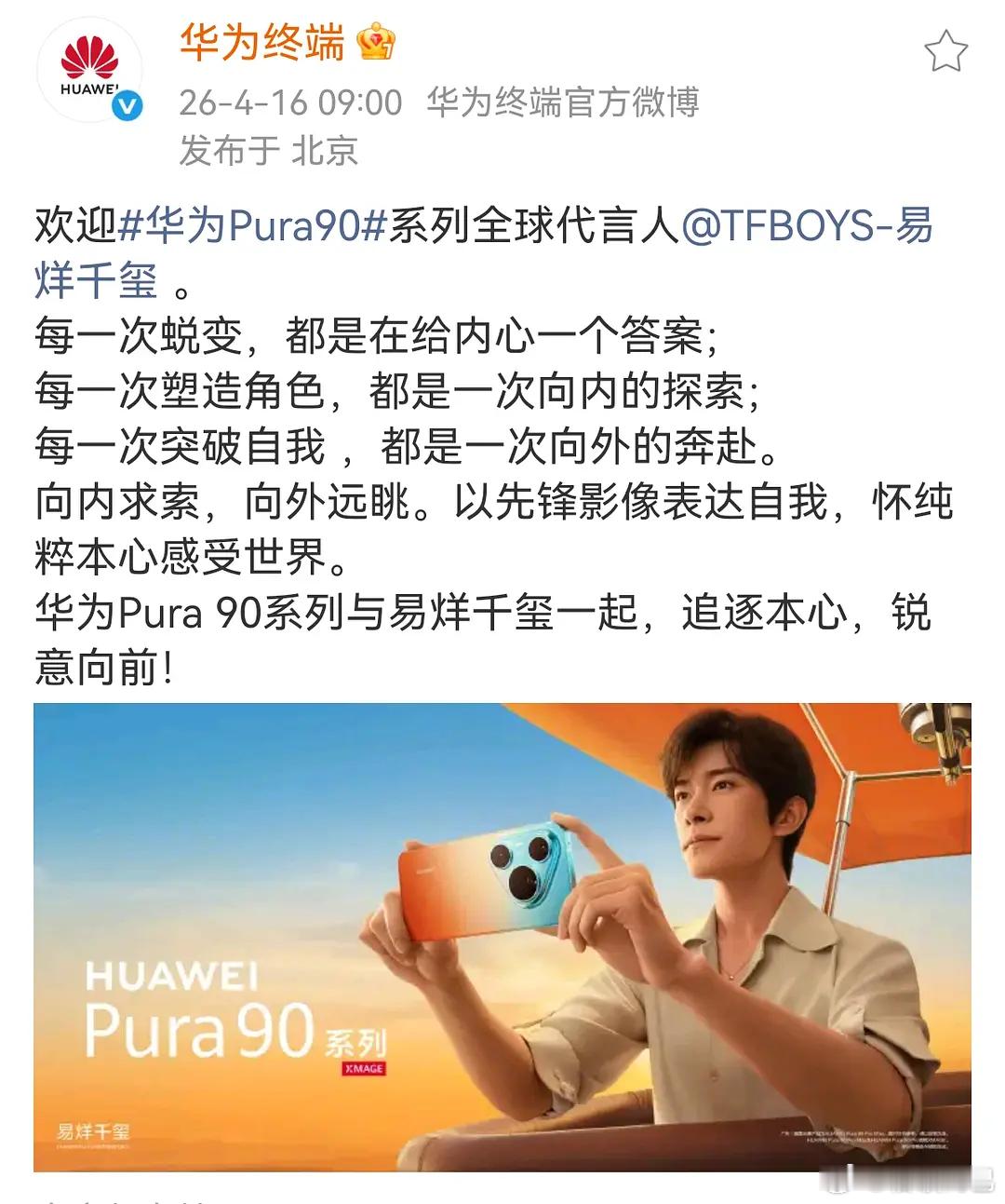 华为今天宣了两个代言人,易烊千玺Pura90系列全球代言人,杨幂鸿蒙智行享界品牌