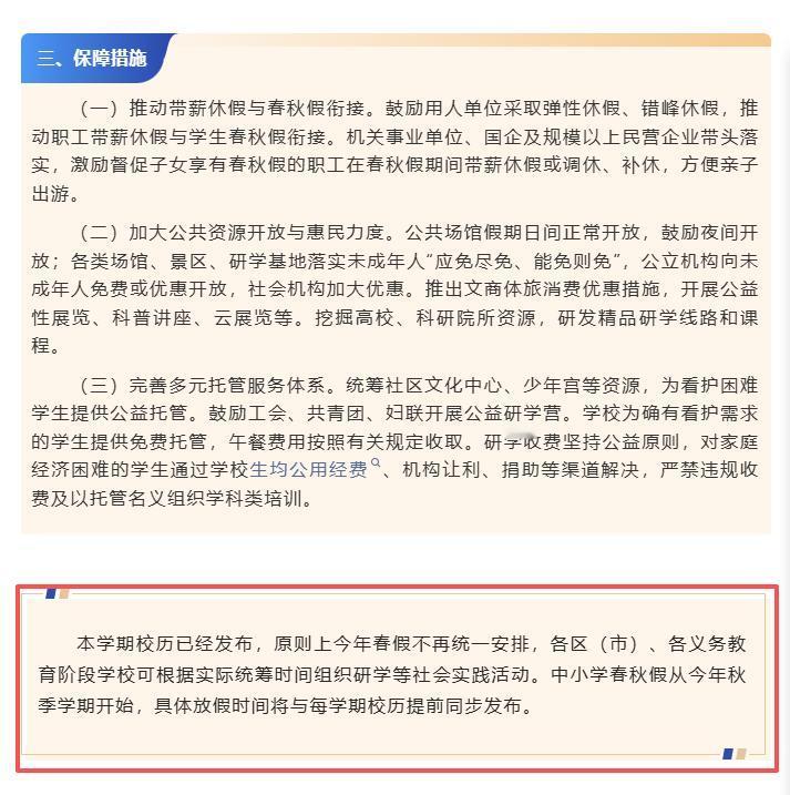 青岛给出的原因是:本学期校历已经发布,原则上今年春假不再统一安排。但青岛没把话说死,留了一个小尾巴,把裁量权给到区市,称“可根据实际统筹时间组织研学等社会实践活动”,这等于把工作压力给到了区市教育部门和学校,颇具太极之风。