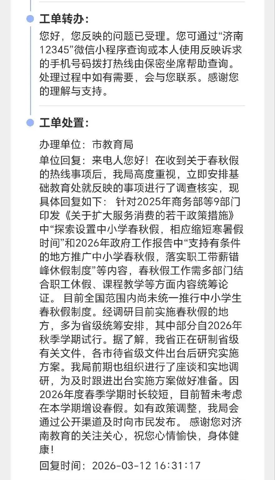 而济南态度就明确多了,直接称是“因2026年度春季学期时长较短,目前暂未考虑在本学期增设春假”。济南的这个原因,还是蛮接地气的,实事求是的讲,今年这个史上最短的学期,假期属实有点密集了,对正常的教学冲击还是有一些影响的。