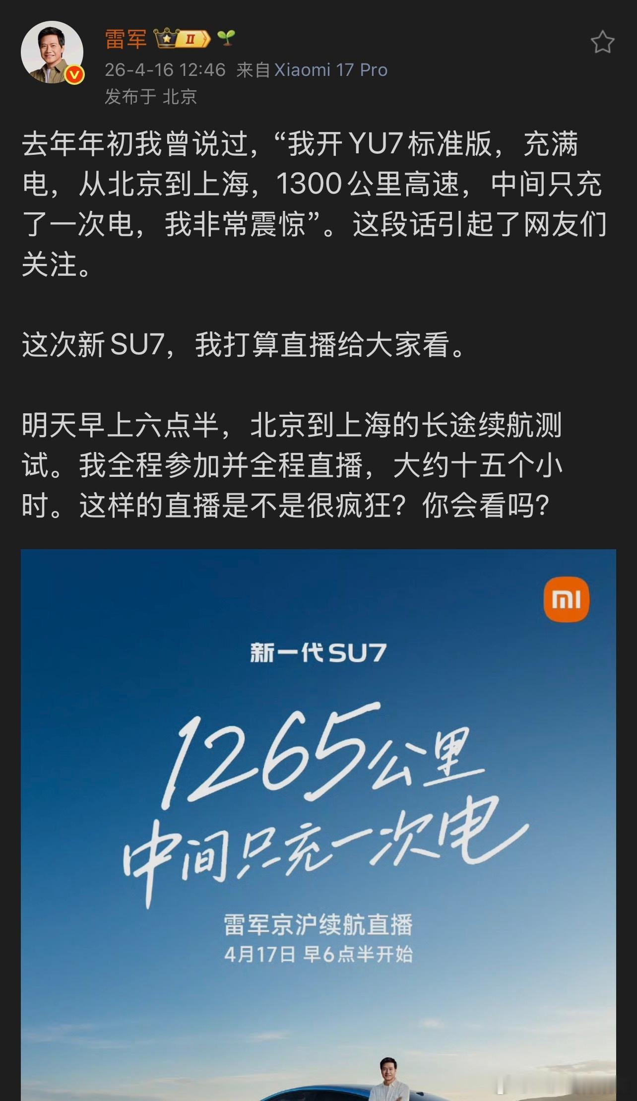4月17日雷军直播开新一代su7 进行北京-上海续航测试你不得不说,雷军真的是楷
