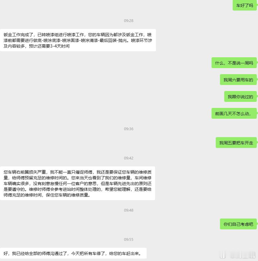 来来来,比亚迪修车记录又来了,我是上周六下午两点送过去了,三点离开的4s店,当时加了接待定损人员的微信。说是需要一星期,我说我周六一定要用车,你帮帮忙。我交了1352元的费用,自费维修。前叶子板凹陷。那个售后定损周一下午四点才通过我的微信,这还是我通过其他人通知他的,因为我的车就是在这家直营店买的。今天我问了那个人,他说还要3-4天才能好。也就是说我周一才能用车。因为有千里眼功能,周六到周一,基本上没动。周二才有挪动,昨天我看沾着胶带。更新,说了一顿,答应给我加急修好!好好的售后,不好好服务,你如果说修不好,或者修的时间长,你给我说,我可以选择修不修!要给顾客确定性,而不是不确定性!比亚迪售后服务比亚迪