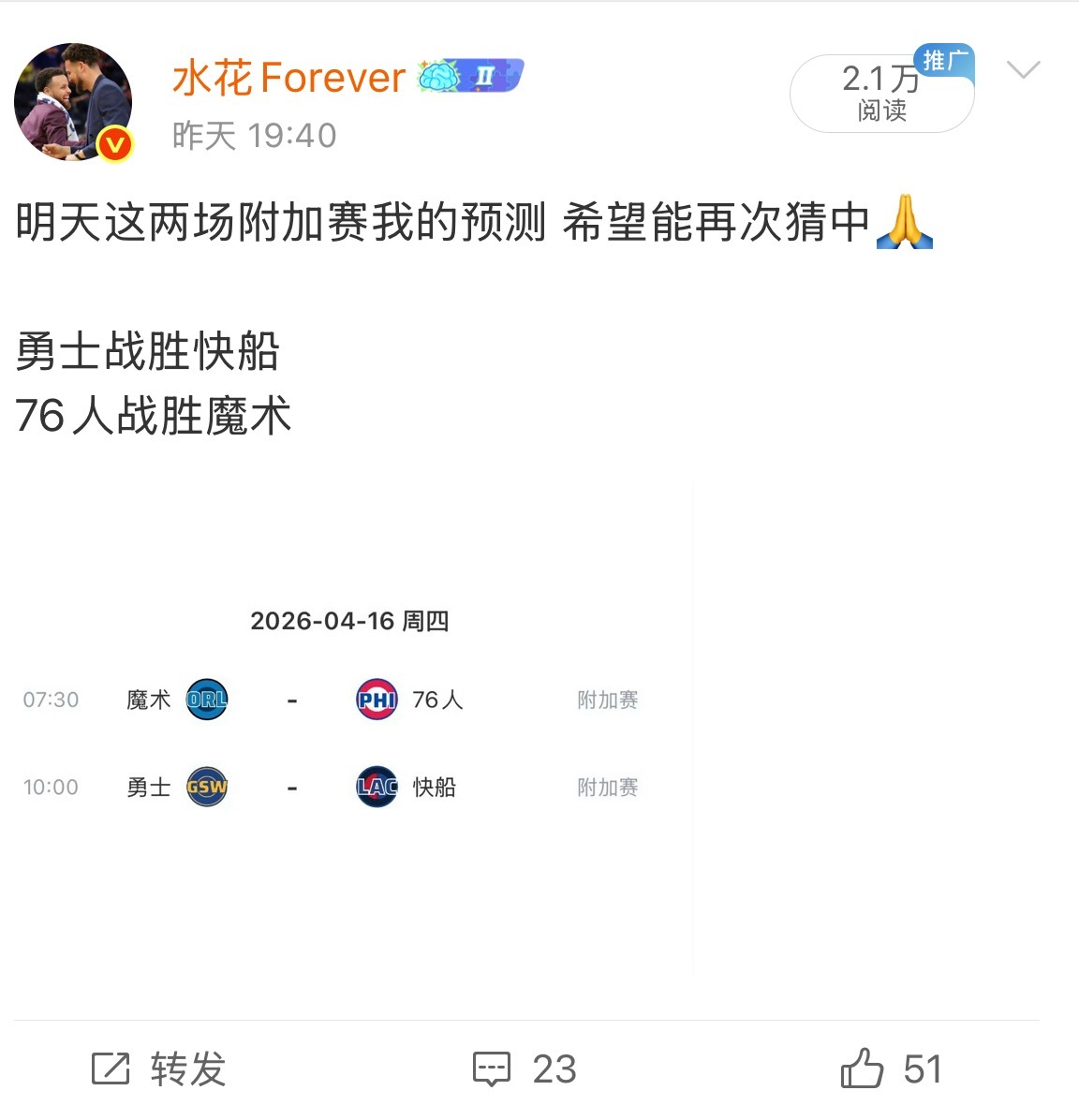 我连续4场附加赛都预测对了 有没有什么夸奖 勇士淘汰快船