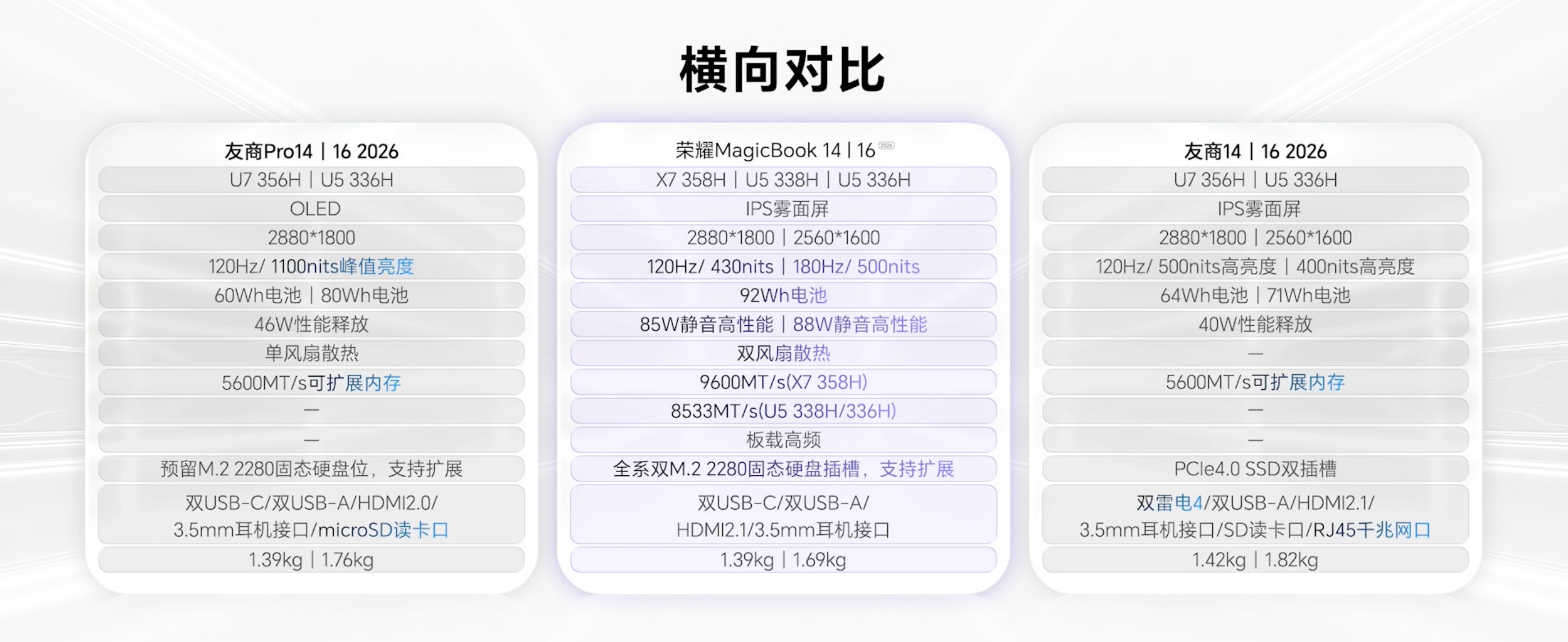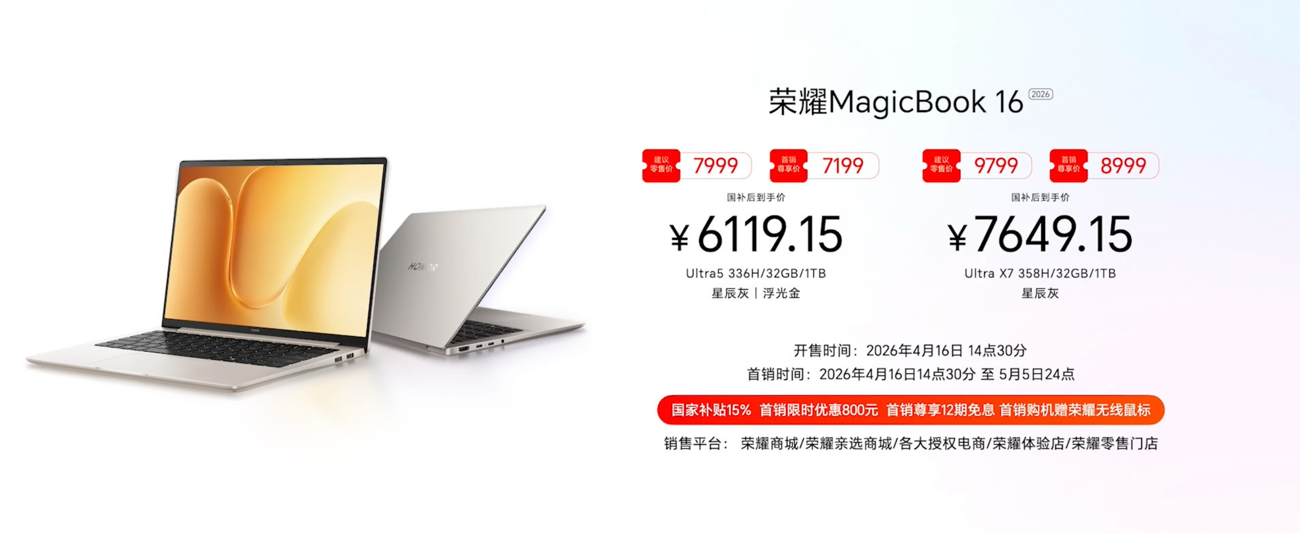 荣耀 MagicBook 16 Ultra5 336H/32G/1T 价格 7999 元,首销尊享价7199 元,国补后到手价 6119.15 元荣耀 MagicBook 14 Ultra X7 358H/32G/1T 价格 9799元,首销尊享价 8999元,国补后到手价 7649.15 元
