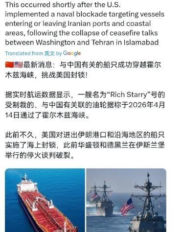美国估计有点下不来台了!4月14日,根据外媒报道,外媒称,根据实时航运数据显示,一艘受制裁、与中国有关的油轮“璀璨富豪号”已于2026年4月14日穿越霍尔木兹海峡。外媒表示,此次通行发生在美伊伊斯兰堡停火谈判破裂后不久。