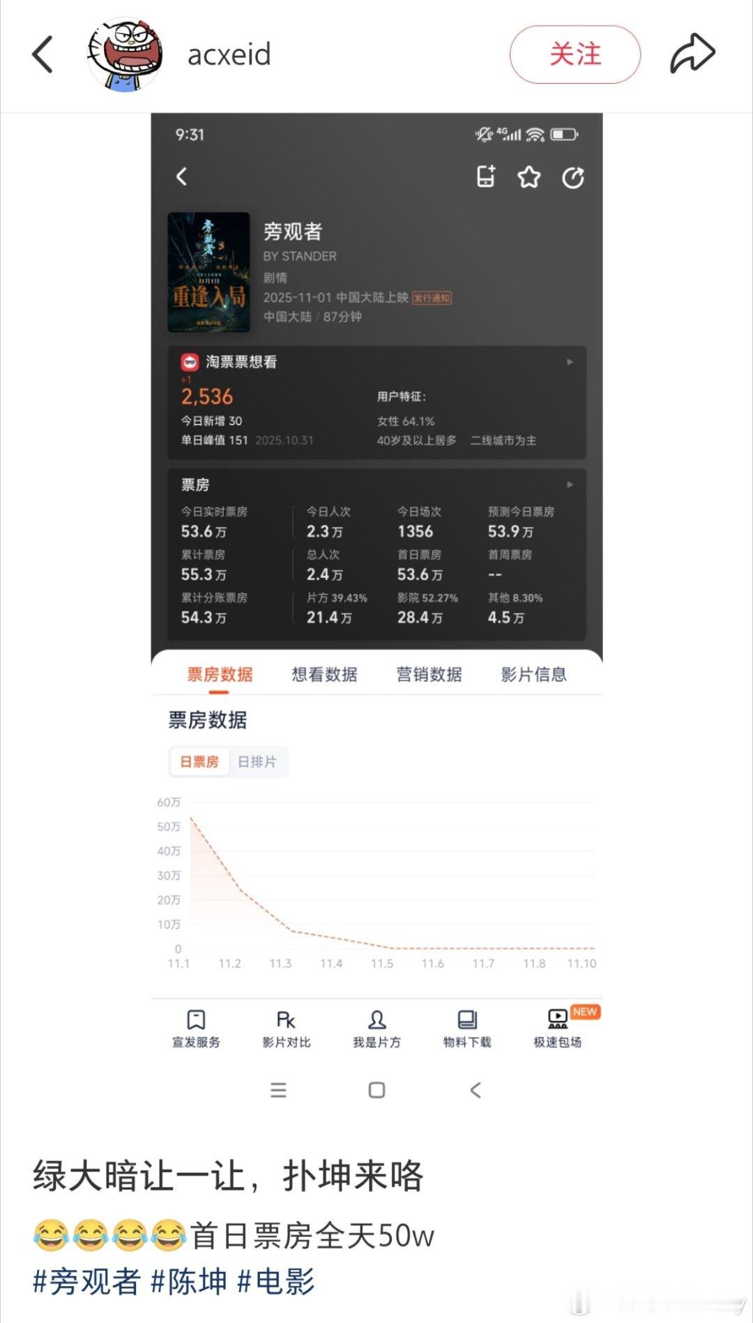 网友开始热议,陈坤是不是遭遇了中年危机,他之前演的那个电视剧《风起陇西》收视率倒数第一,后面电影和剧几乎全扑,去年上的电影《旁观者》,首日票房仅仅只有50w,新电影《1840》估计又要扑了吧!