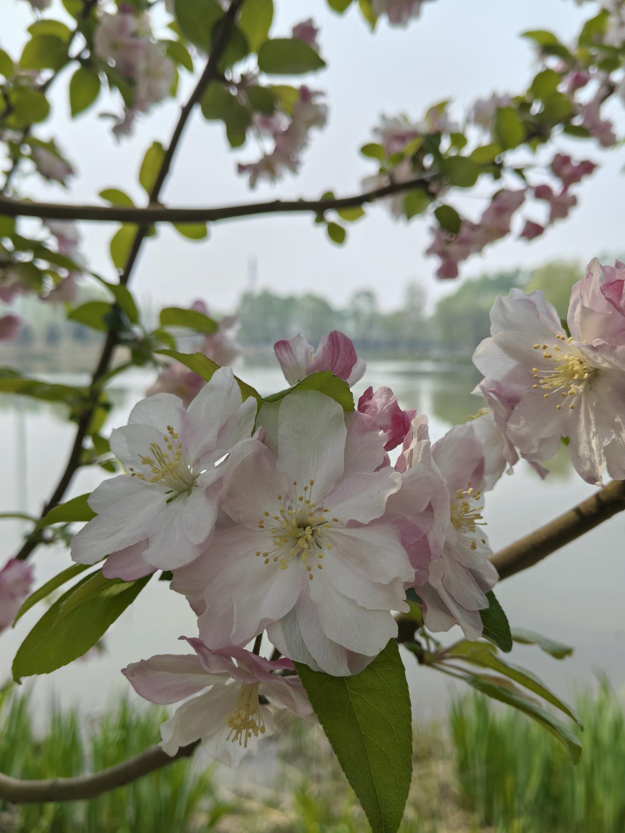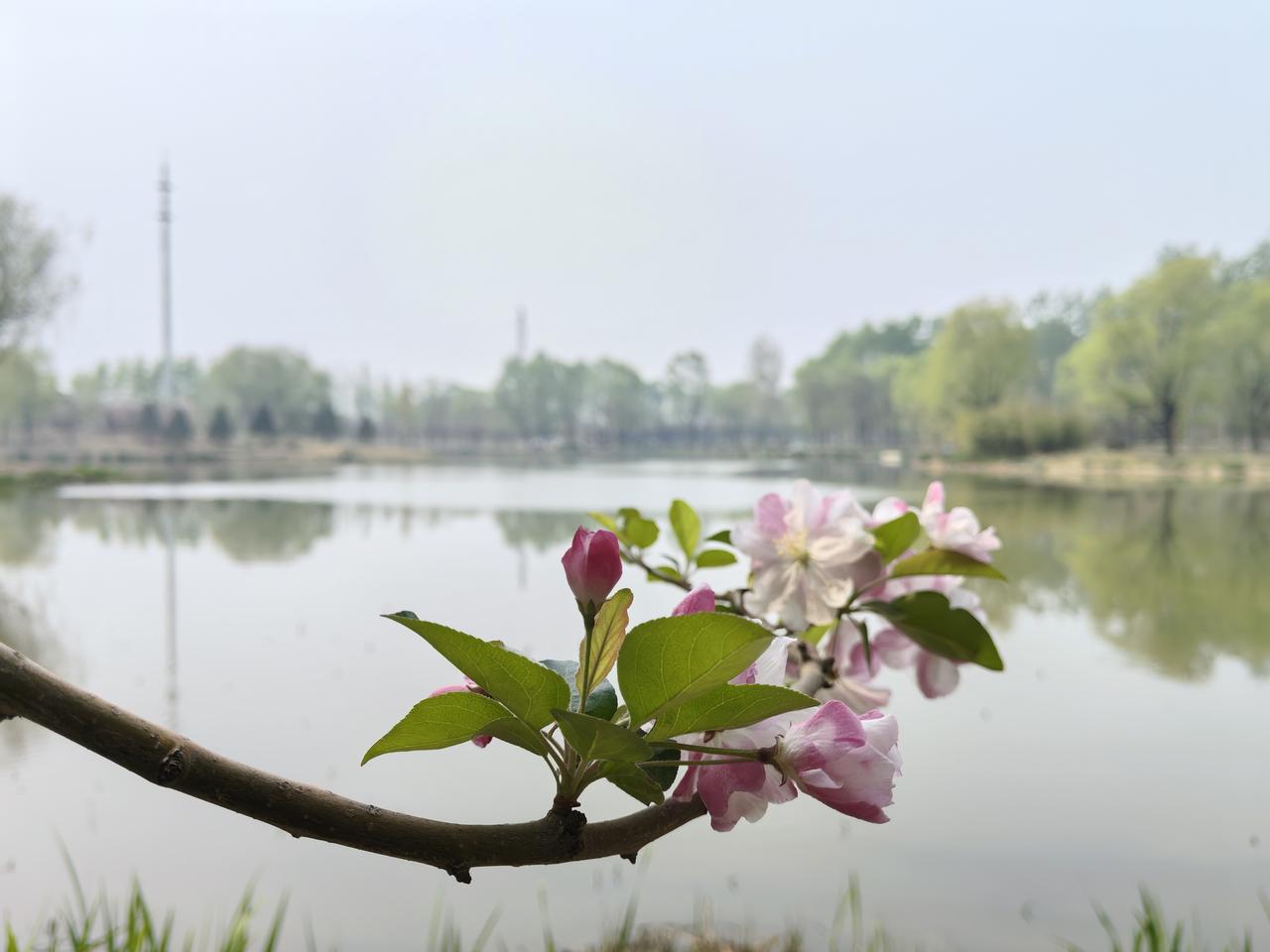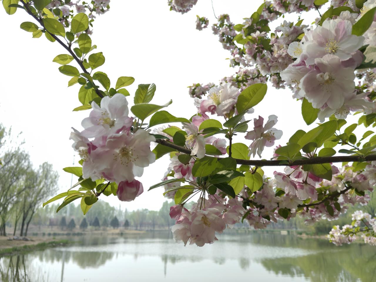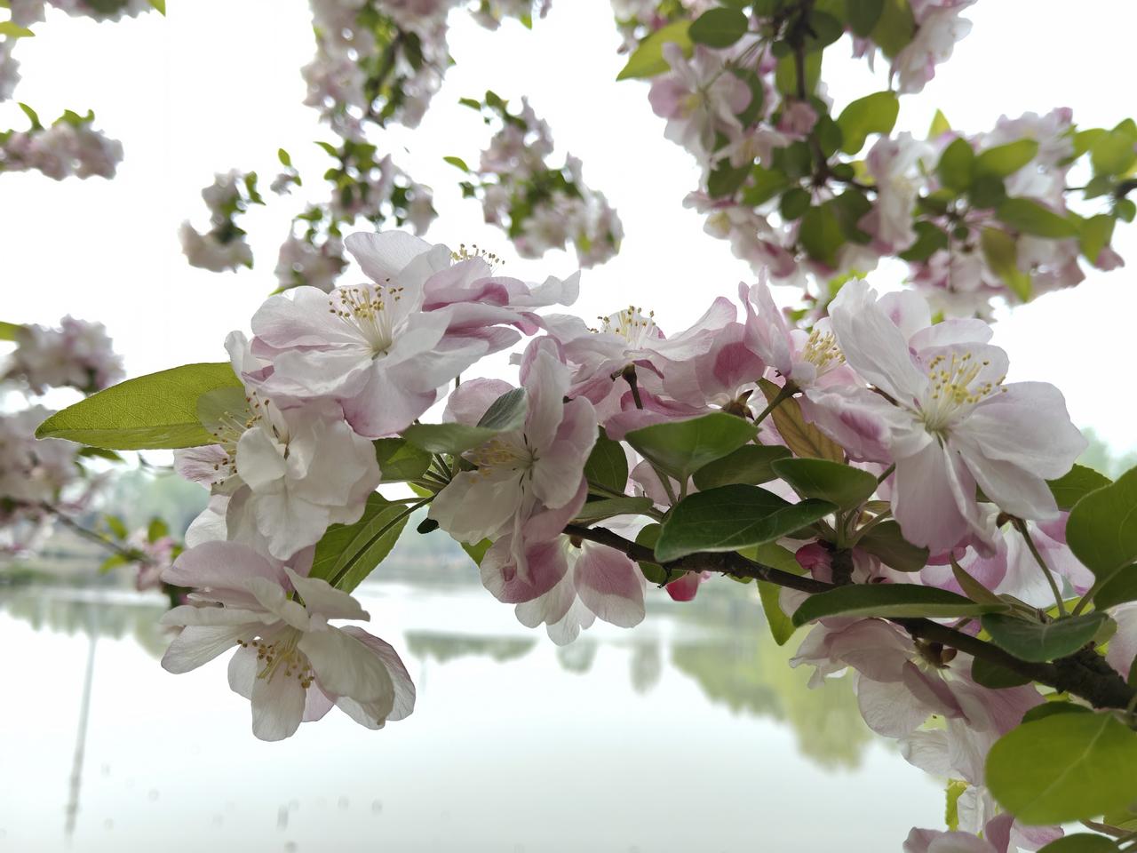 湖边的西府海棠 当你站在湖边欣赏海棠花时是什么感觉? 站在湖边看海棠,仿佛时间都慢了。湖水映着花的倒影,风一吹,花瓣轻颤,像在和湖水说着悄悄话。那份宁静里,花是静的,水是动的,心也跟着沉下来,连呼吸都怕惊扰了这份岁月静好。