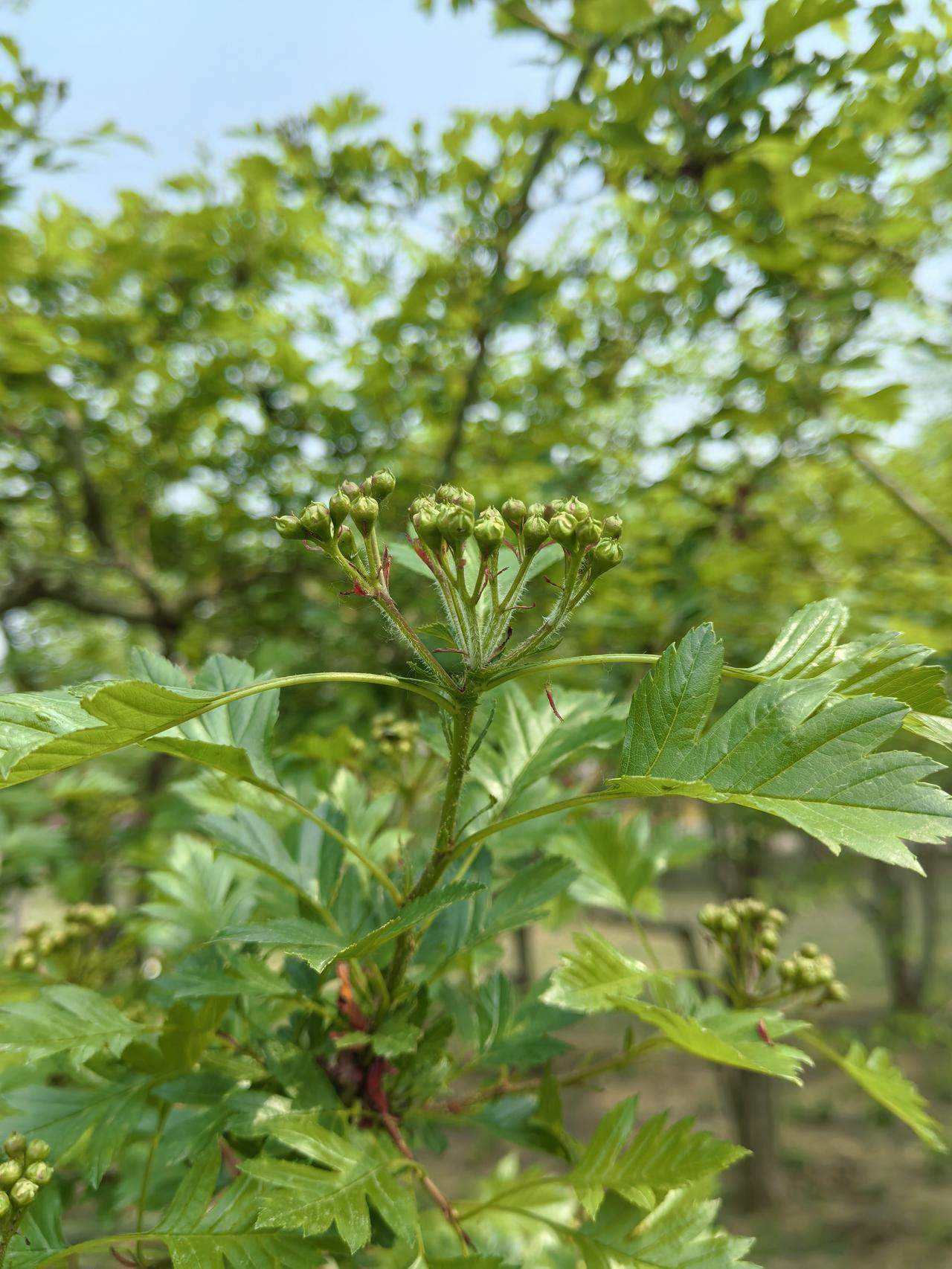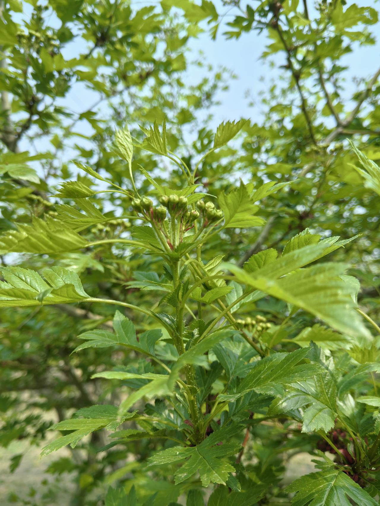 当我走在湿地公园山楂树下的时候,虽然没有开花但被山楂树叶所吸引。