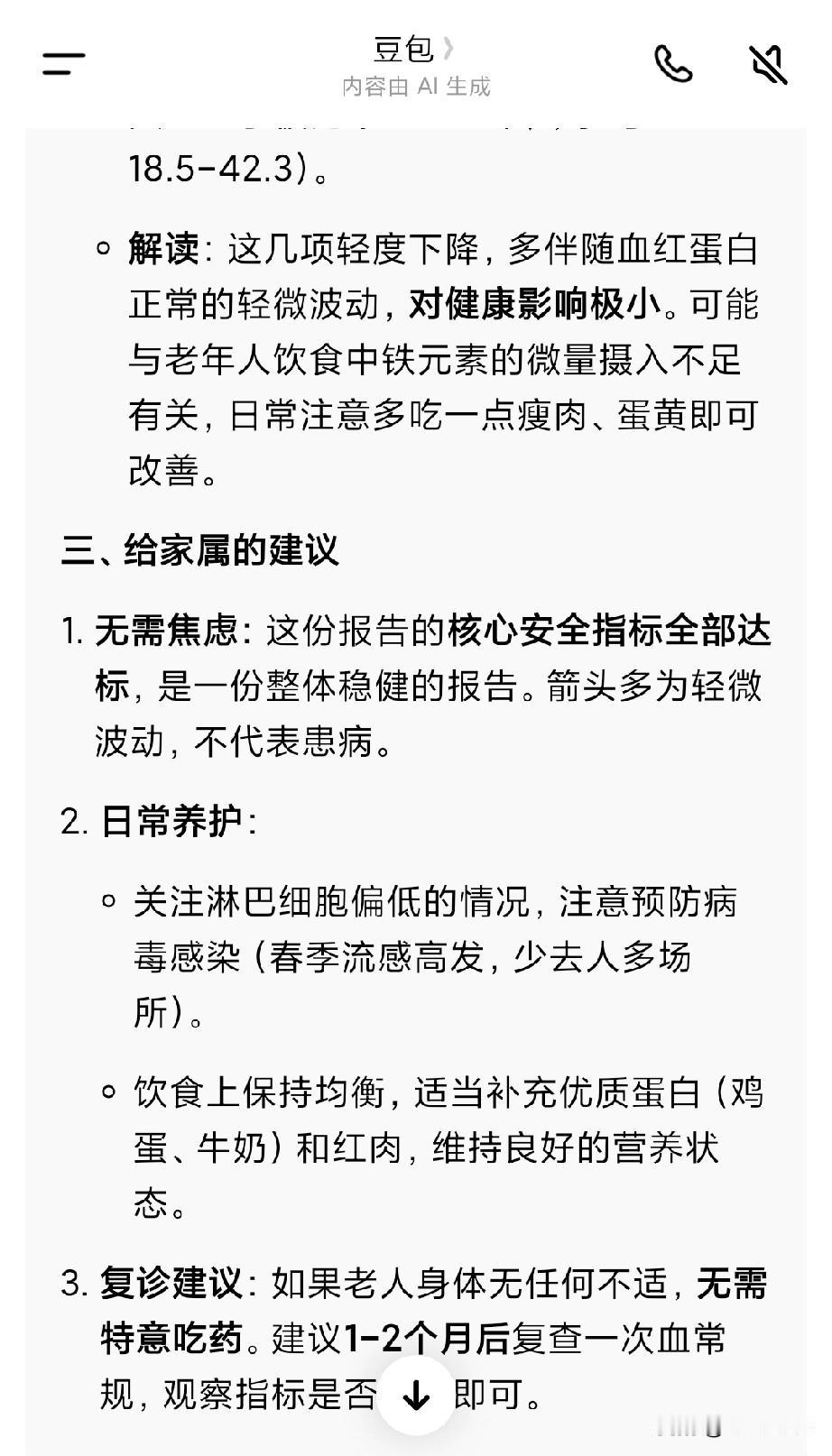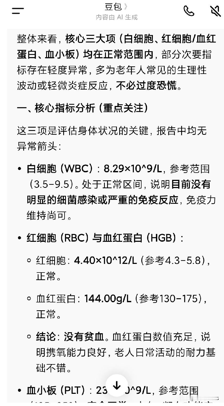 他把老人血液检查的结果发给了我,我仔细看了一下,一点问题也没有。另外我把结果发给豆包,让他给解释了一下。