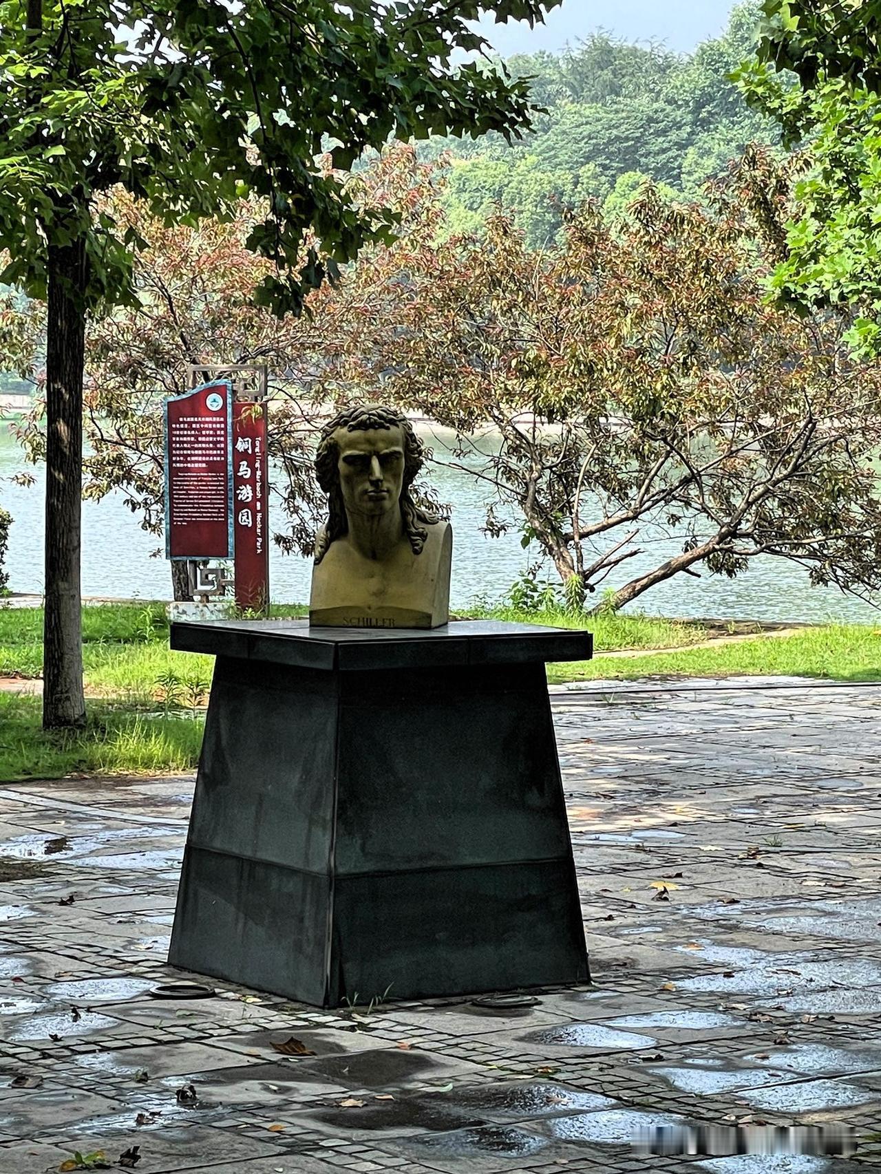 在“铜马游园”的中心位置,竖有德国18世纪著名诗人、哲学家、历史学家和剧作家,德国启蒙文学代表人物之一的席勒头像。