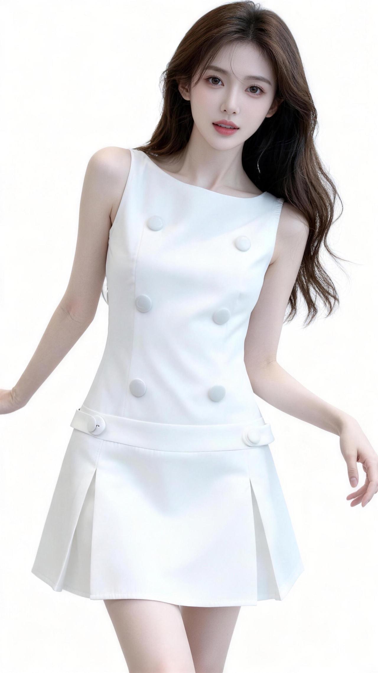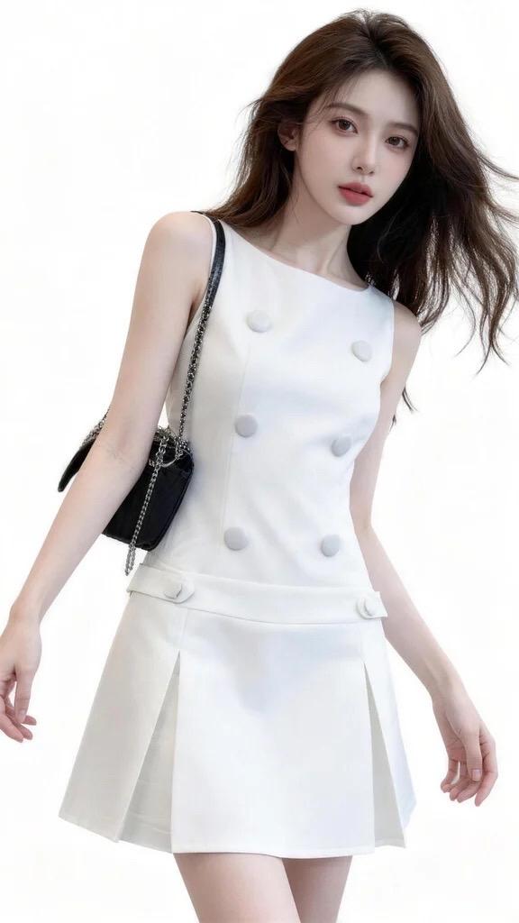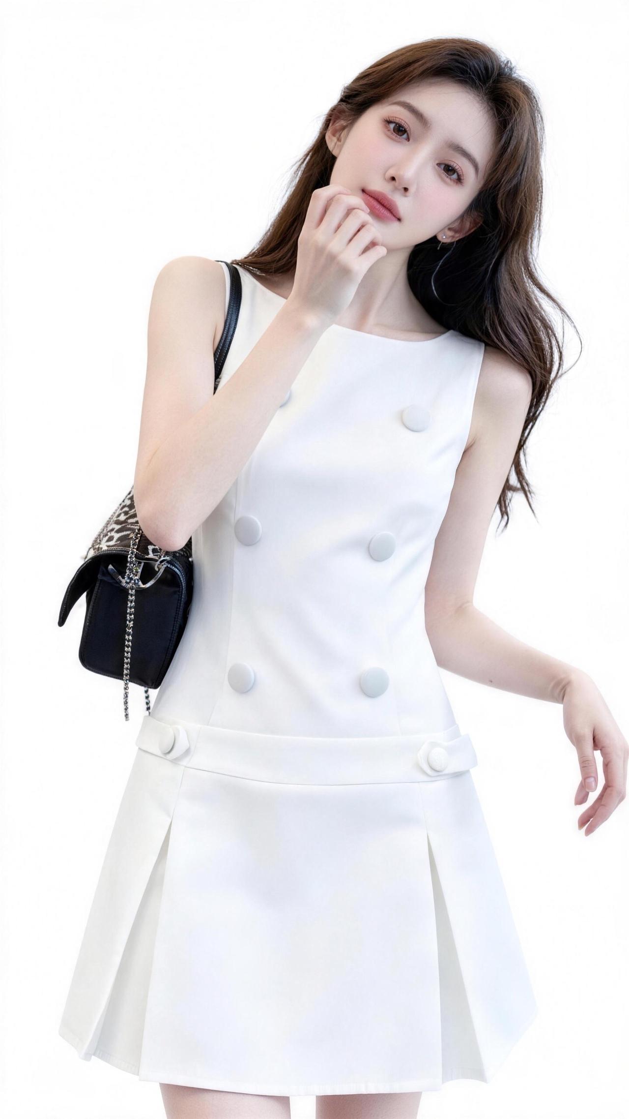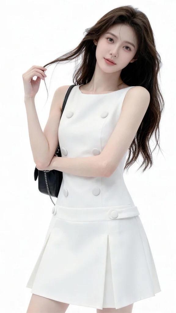 一袭V领无袖白色连衣裙,搭配精致小包,整体干净清爽又显气质。
