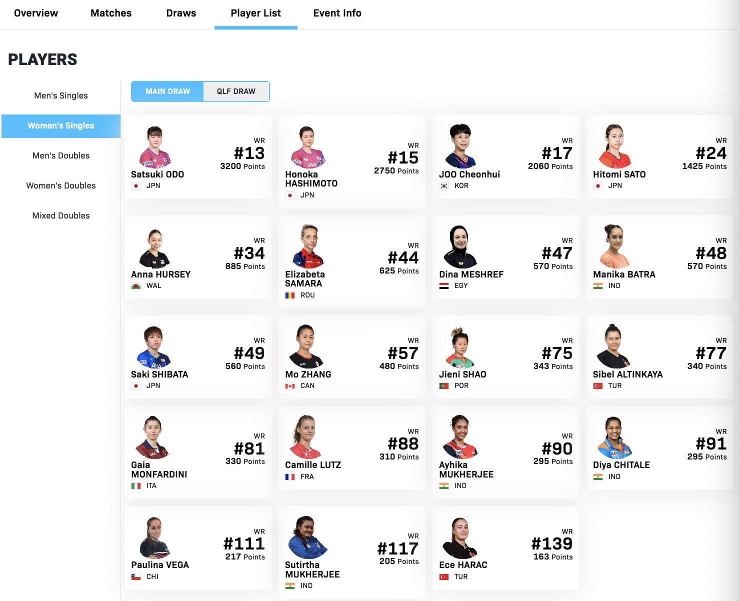 WTT常规挑战赛拉各斯站5.19-5.24丨女单参赛名单【正赛】大藤沙月🇯🇵、桥本帆乃香🇯🇵、朱芊曦🇰🇷、佐藤瞳🇯🇵、安娜·赫西🏴󠁧󠁢󠁷󠁬󠁳󠁿、伊丽莎贝塔·萨马拉🇷🇴、蒂娜·梅谢芙🇪🇬、玛尼卡·巴特拉🇮🇳、芝田沙季🇯🇵、张墨🇨🇦、邵杰妮🇵🇹、西贝尔·阿尔廷卡亚🇹🇷、盖娅·蒙法蒂尼🇮🇹、卡米尔·卢茨🇫🇷、艾希卡·穆克吉🇮🇳、迪亚·帕拉戈·奇塔莱🇮🇳、保琳娜·维加🇨🇱、苏提尔塔·穆克吉🇮🇳、埃切·哈拉克🇹🇷