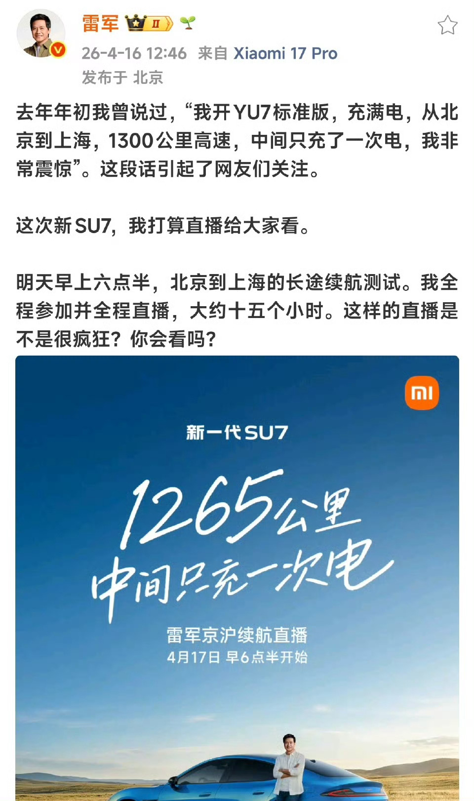 雷总今年都56岁了,还能这种千里长途的直播,太敬业了。我56岁的时候肯定没这个体力和精力了。我今年就没咋跑超远长途了,感觉累哈哈。小米SU7现在已经不是1000公里只充一次电,可以做到1265公里只充一次电,新一代SU7能耗更优秀。明天早上6点半就开始,全程15个小时。算上整备时间,上厕所时间,吃饭时间,1265公里十五个小时,开的真的不慢的。斗叔聊车智驾数码团