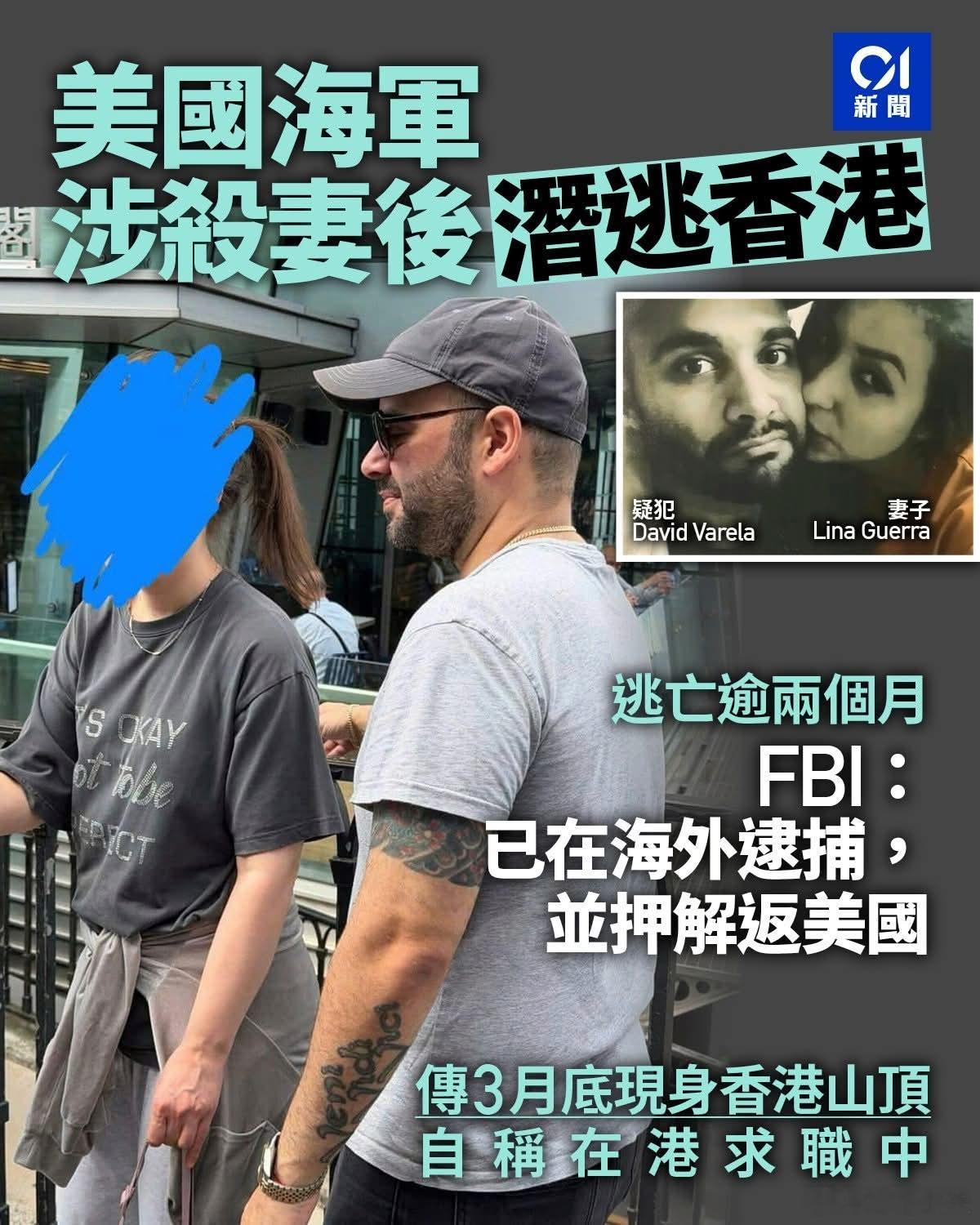美国军人杀妻后疑潜逃香港美国38岁男子David Varela涉嫌杀害妻子Lina Guerra,调查人员早前发现他于2月5日左右乘坐飞机前往香港。美国联邦调查局(FBI)4月15日公布最新消息,称已成功在美国海外逮捕他,并将他押解到美国。美媒WAVY引述Guerra家人称,在美国警方通知下,才知道疑犯Varela现已被拘捕,还相信他最快会在周四出庭。美媒早前引述FBI文件指出,在Lina Guerra遗体被发现后同时,Varela搭乘前往香港的航班,且其WhatsApp资讯也显示,David Varela发送的位置资料来自香港。Varela也因涉嫌杀Guerra被控有一级谋杀罪。另外,日前也有报道指,David Varela疑于3月底现身香港。有俄罗斯籍女子在3月底在香港山顶遇上Varela,对方说已抵港一个多月,并尝试在港求职,「我和朋友们在香港。我们在景点排队时遇到了他。他自我介绍为 David,说他在寻找一位俄罗斯妻子。」粤港澳大湾区美国出台对伊石油运输网络新制裁
