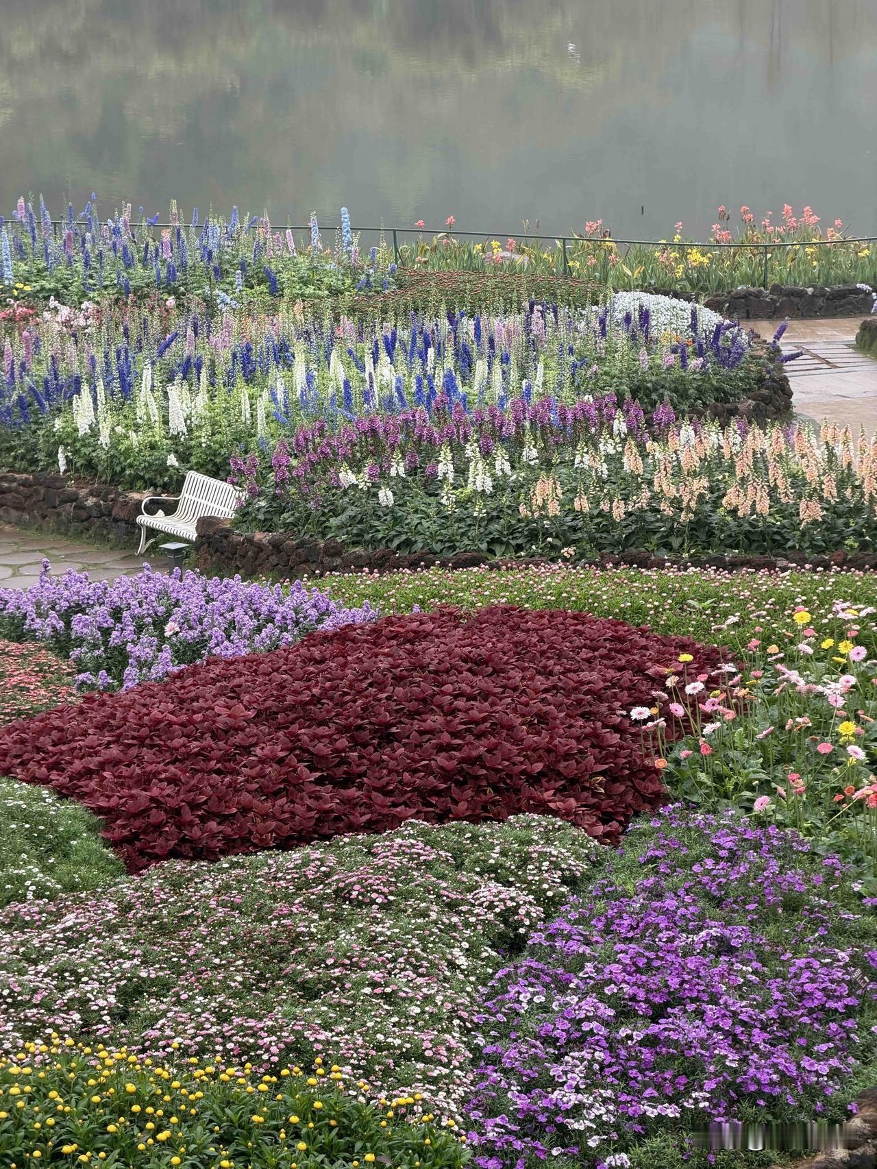 沿着坡地铺展,搭配奇石碧水,油画感直接拉满