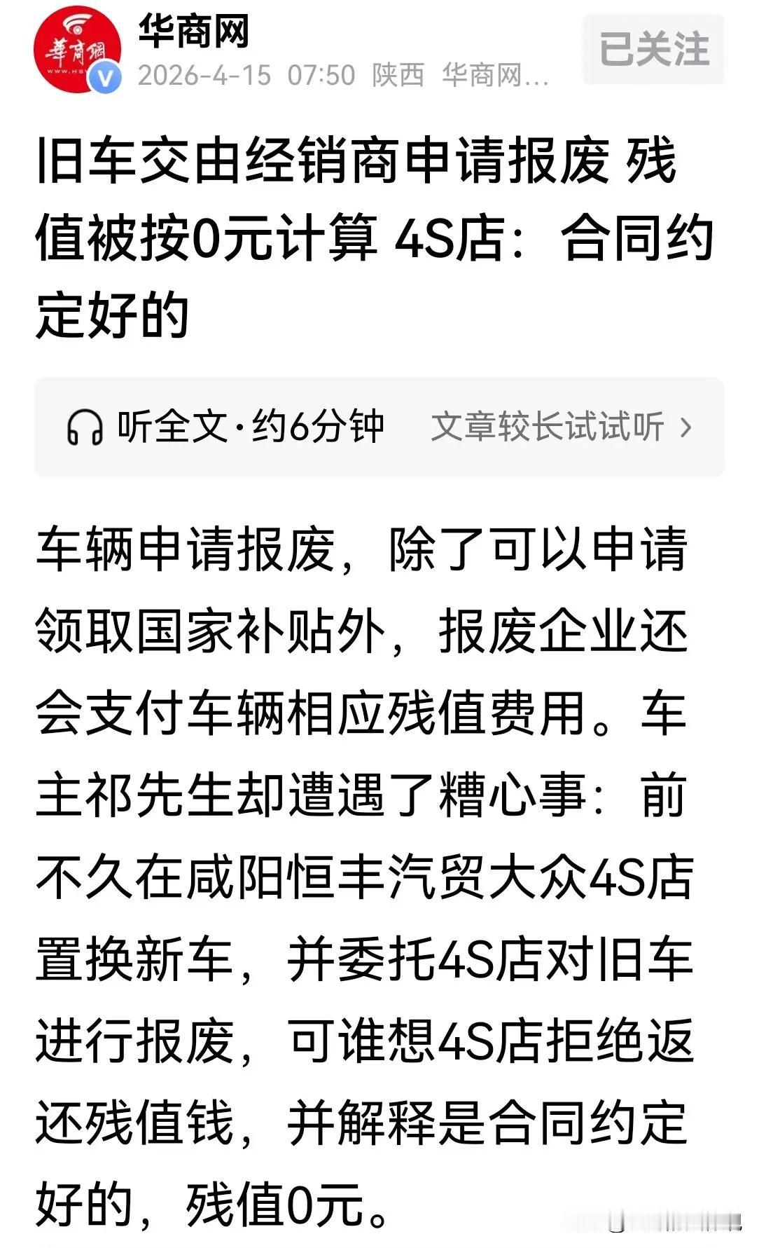 诸位朋友,今儿咱们单说一桩发生在陕西咸阳的“买车奇遇记”。这事儿,听着像“哑巴吃黄连”的冤大头故事,实则是一记敲在咱们心坎上的“警钟”。车主祁先生置换新车,把旧车交给4S店报废,本以为能拿国家补贴加车辆残值“双份快乐”,谁曾想,4S店一句“合同写着残值0元”,直接让他“竹篮打水一场空”。这哪是“置换”?分明是“套路”,让人心里堵得慌。