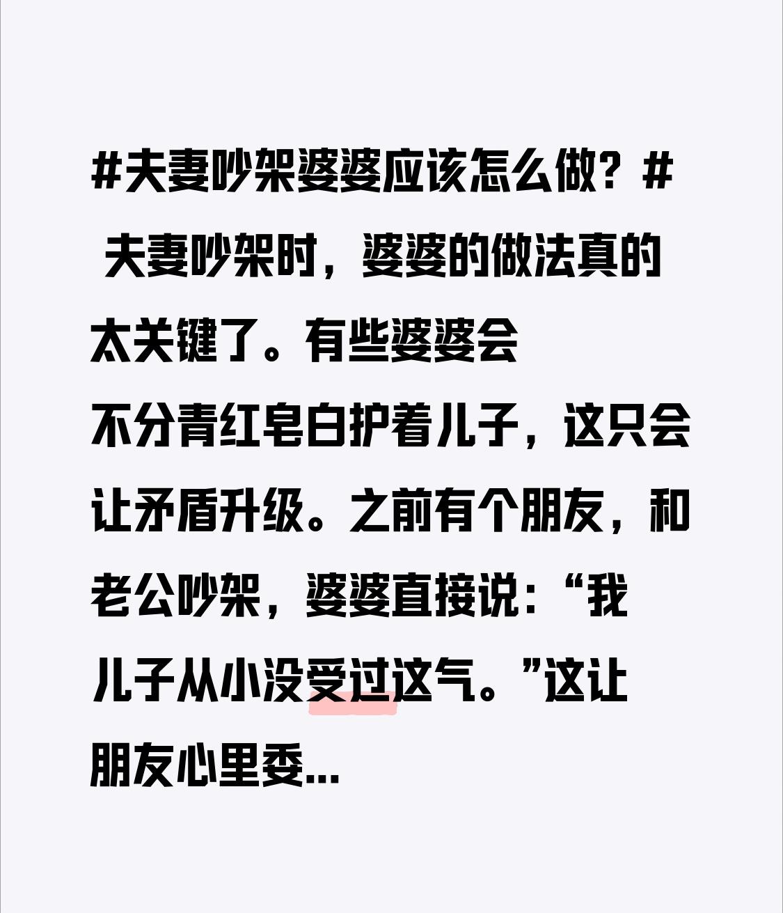 夫妻吵架时,婆婆的做法真的太关键了。有些婆婆会不分青红皂白护着儿子,这只会让矛盾升级。之前有个朋友,和老公吵架,婆婆直接说:“我儿子从小没受过这气。”这让朋友心里委屈极了,本来小事,结果闹得要离婚。