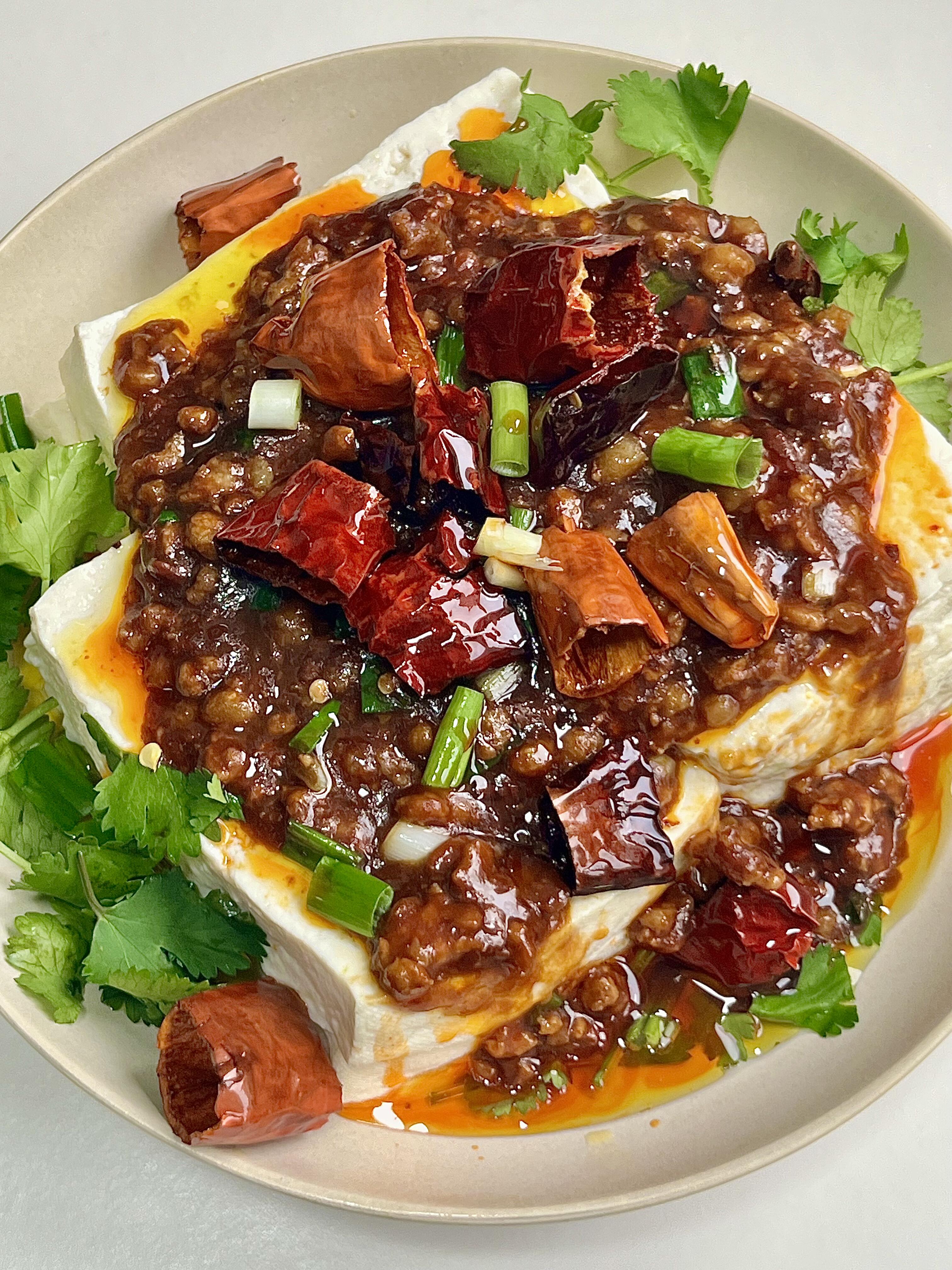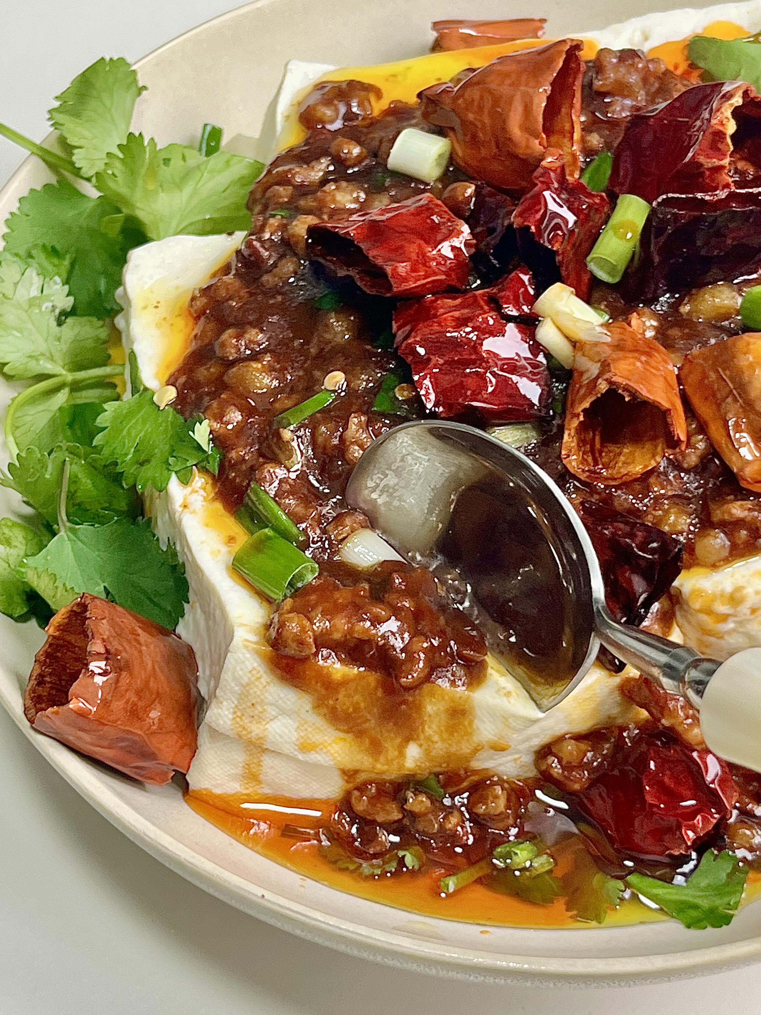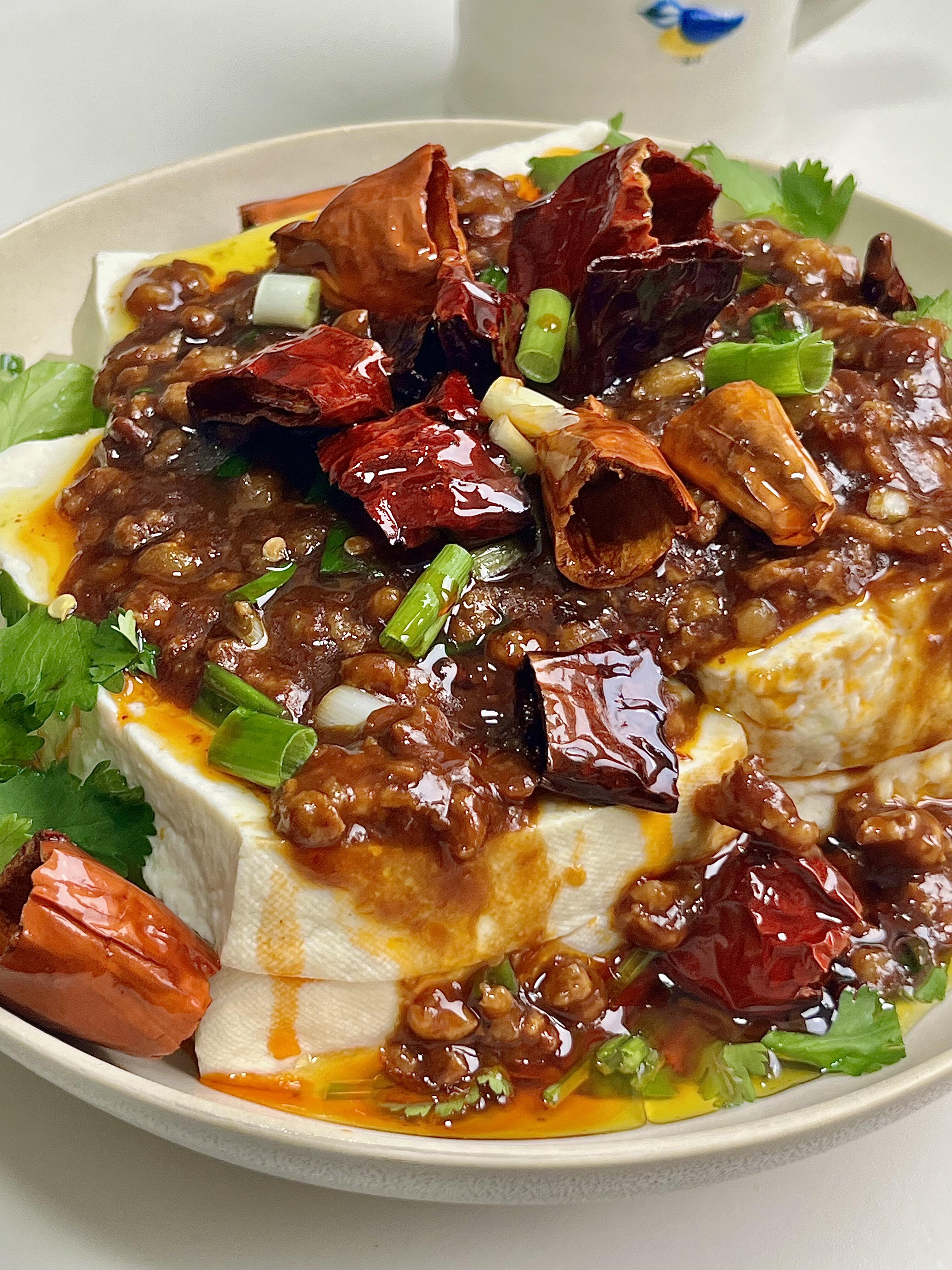 6️⃣ 洗干净锅,放少许油,油热后放入红辣椒段,炸出香味,趁热浇在碗里的肉酱上,激出辣椒的香气,最后把碗里的肉酱连同辣椒油一起浇在豆腐上,撒上香菜,就可以开吃啦!
