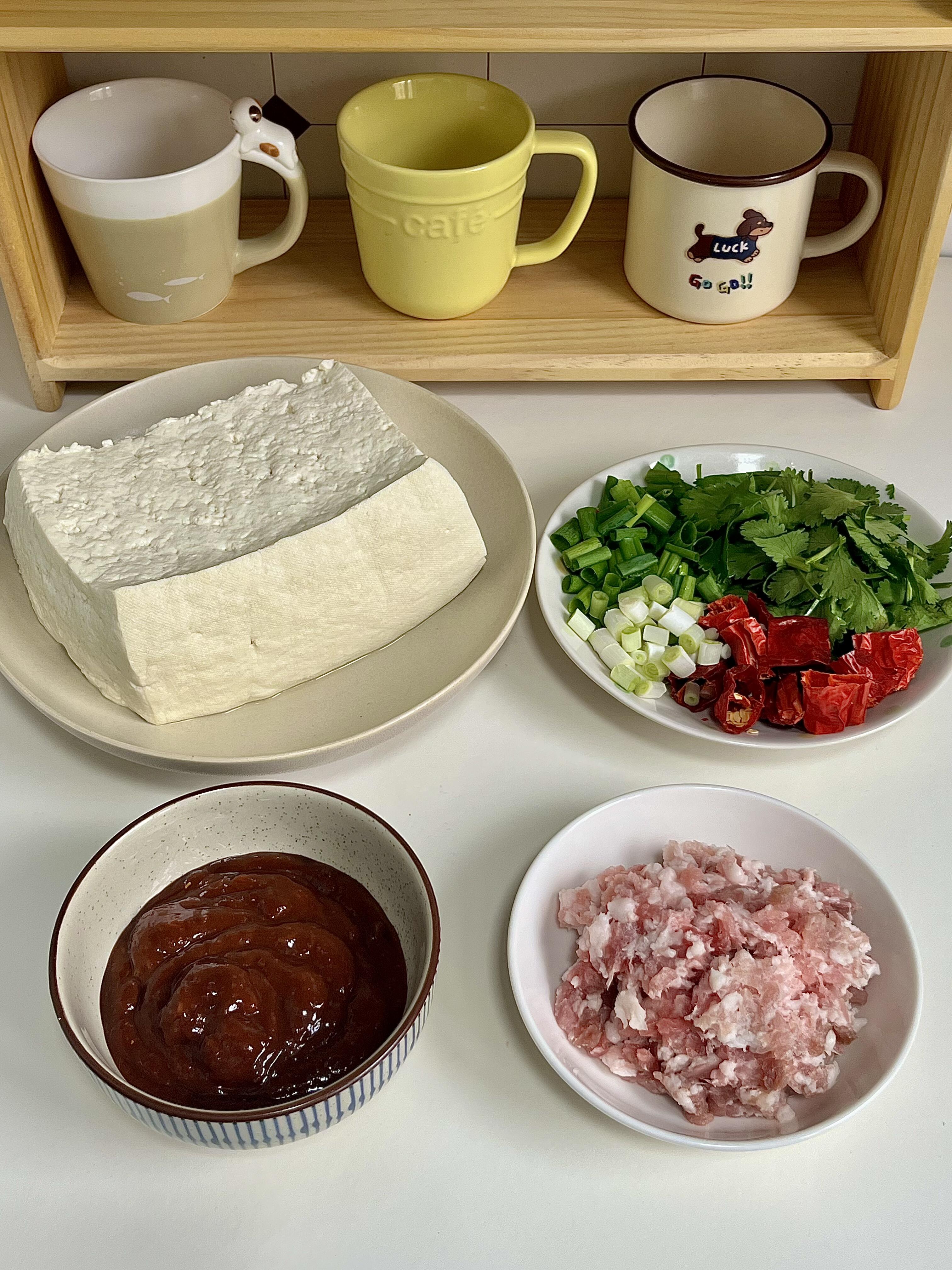 1️⃣ 先处理食材,豆腐切成大片,葱花、香菜、红辣椒段切好备用,肉末提前备好(不用腌制,省事又入味)。