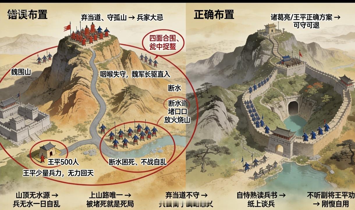 你不下山?渴死你。你下山?我在山脚下以逸待劳。这就是王平当时死命劝马谡的原因,王平是个老行伍,他知道打仗不是下棋,士兵渴了三天,别说冲锋,连刀都提不起来。