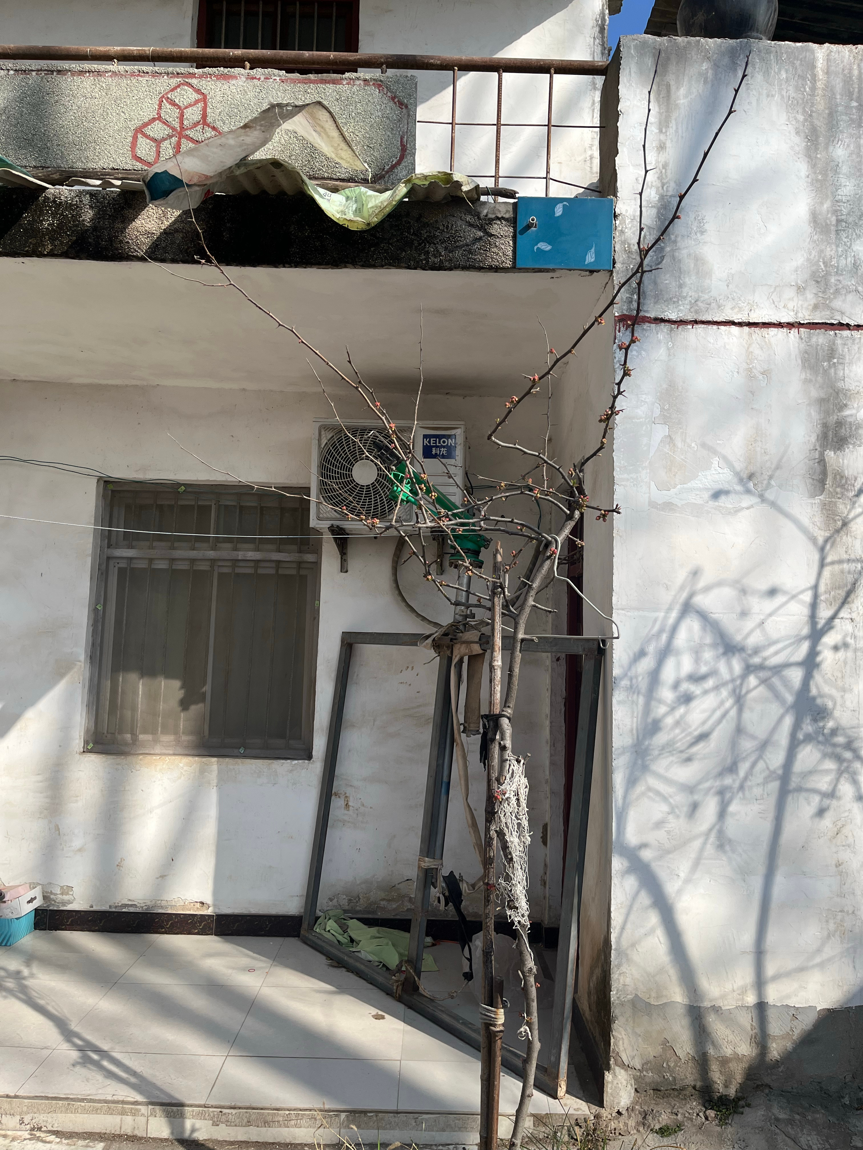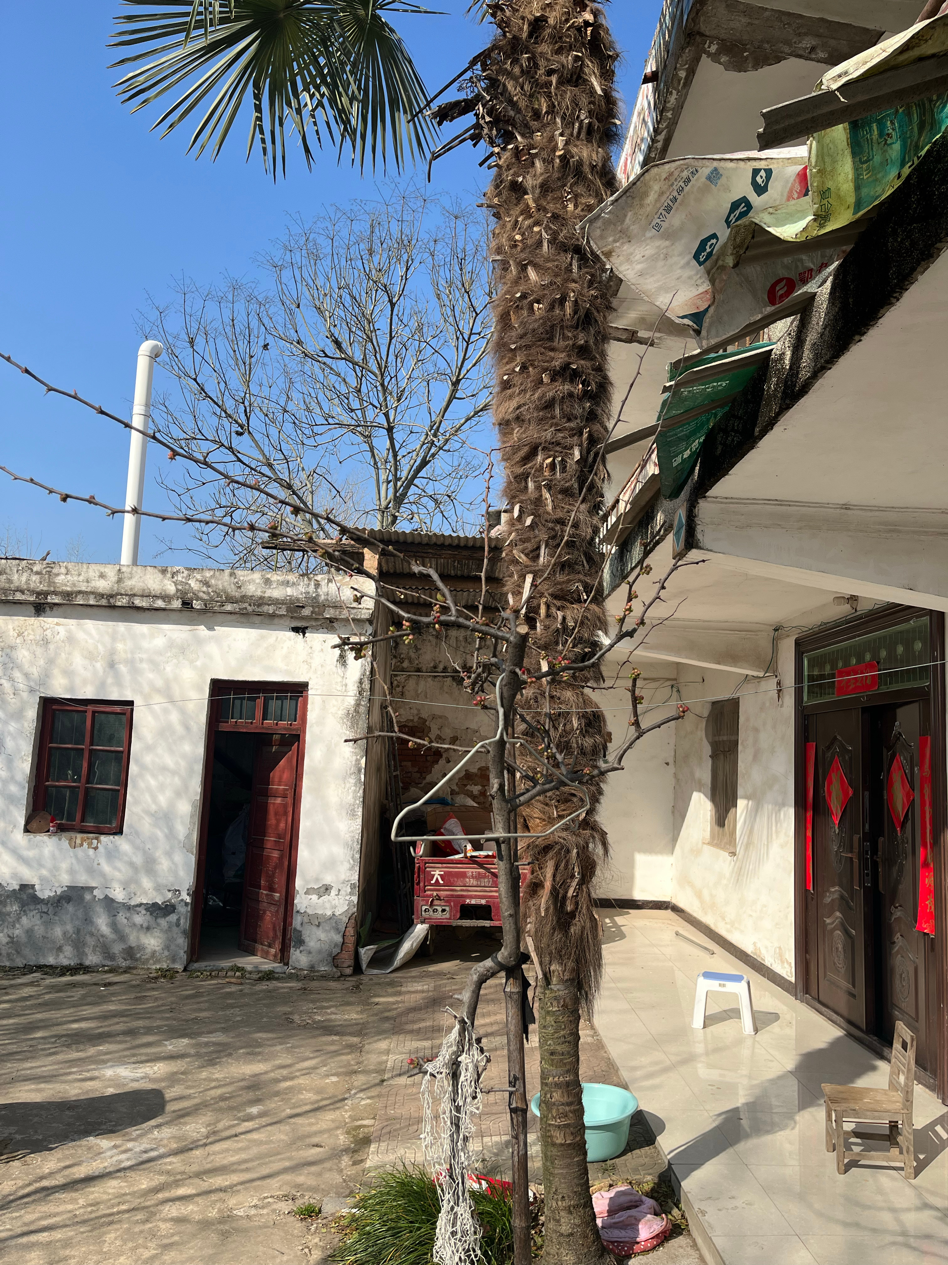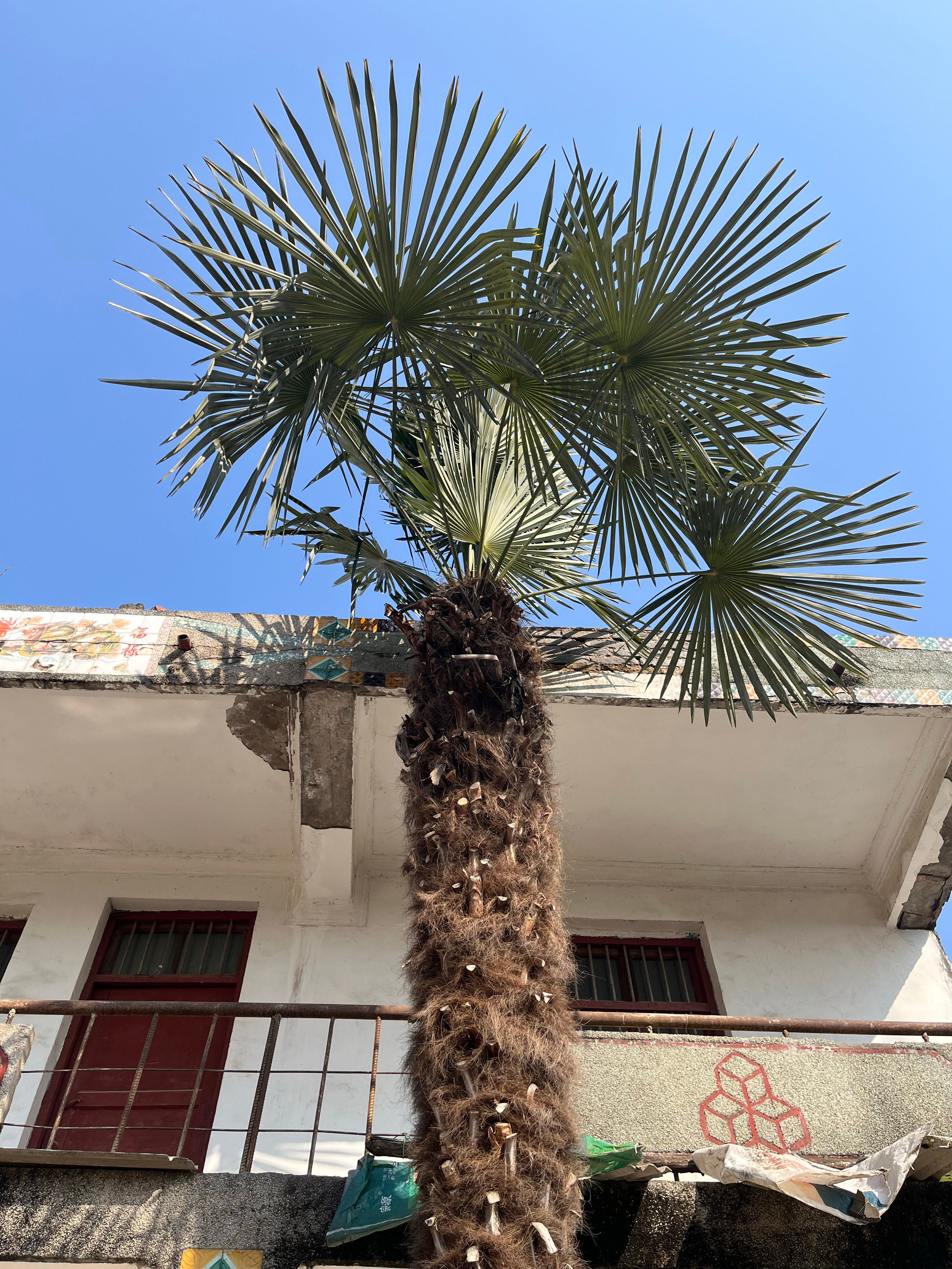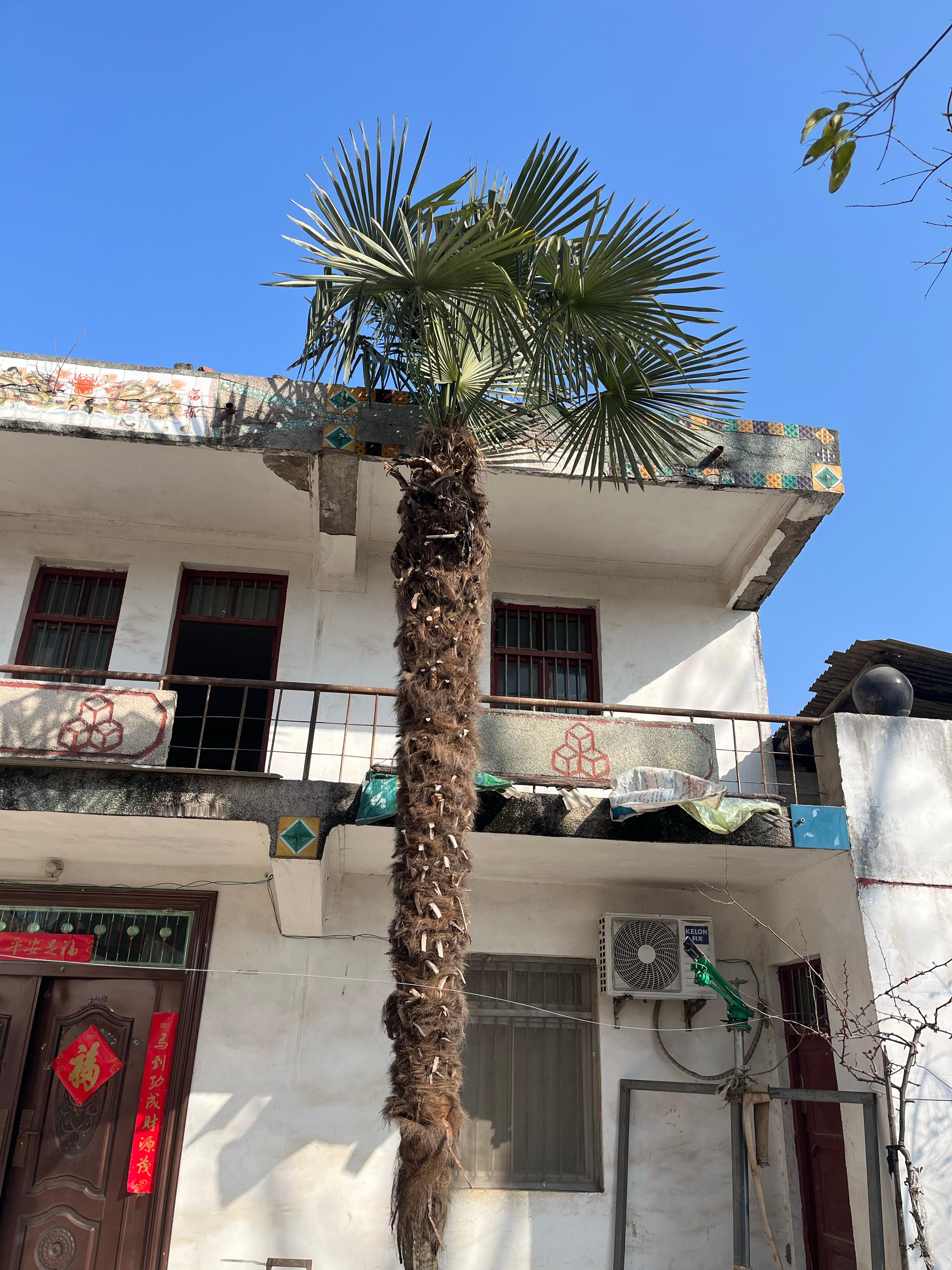 我老家院子里的扇叶棕榈,有20多年树龄,具体多少年我爸妈也记不清了,旁边是与它同