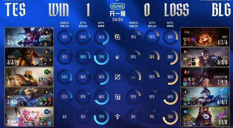 首局比赛Xun赵信gank下路帮开局被线杀的Viper伊泽瑞尔解围,但是上路ZUIAN薇恩后选直接对位counter住了Bin纳尔!两度对位单杀,还帮助JackeyLove伊泽瑞尔大招收了一次Bin纳尔的人头!