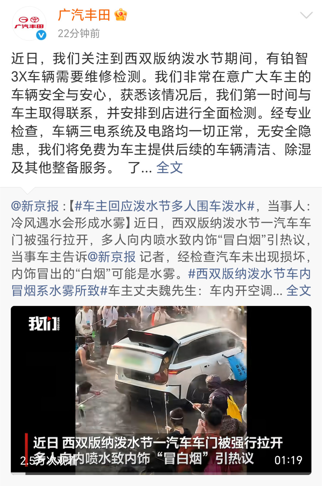 车主回应泼水节多人围车泼水西双版纳泼水节围车喷水事件后续,车主已正式回应:网传车内“冒烟”,其实是空调冷风遇水形成的水雾,并非车辆故障。事件发生后,广汽丰田第一时间联系铂智3X车主,迅速安排车辆到店检测。经专业检查确认,车辆三电系统及电路均正常,无安全隐患。同时,广汽丰田还为车主提供免费清洁、除湿、整备服务,并保障返程沿途用车安心。从极速响应到贴心售后,既展现出铂智3X过硬品质,也体现了品牌对车主的用心守护,必须点赞。西双版纳泼水节车内冒烟系水雾所致