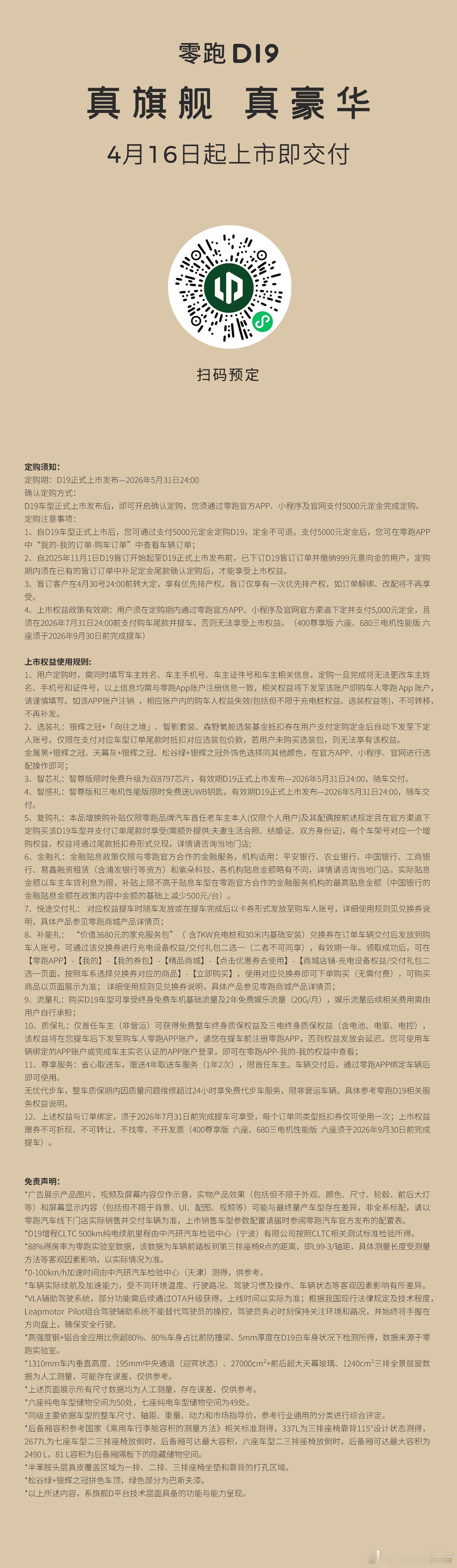 4月16日,零跑D19正式上市,新车共推出7款车型,售价区间为21.98-26.98万元。新车将于今日正式开启交付。该车为D系列与LEAP 4.0架构首款车型,定位旗舰大型SUV。
