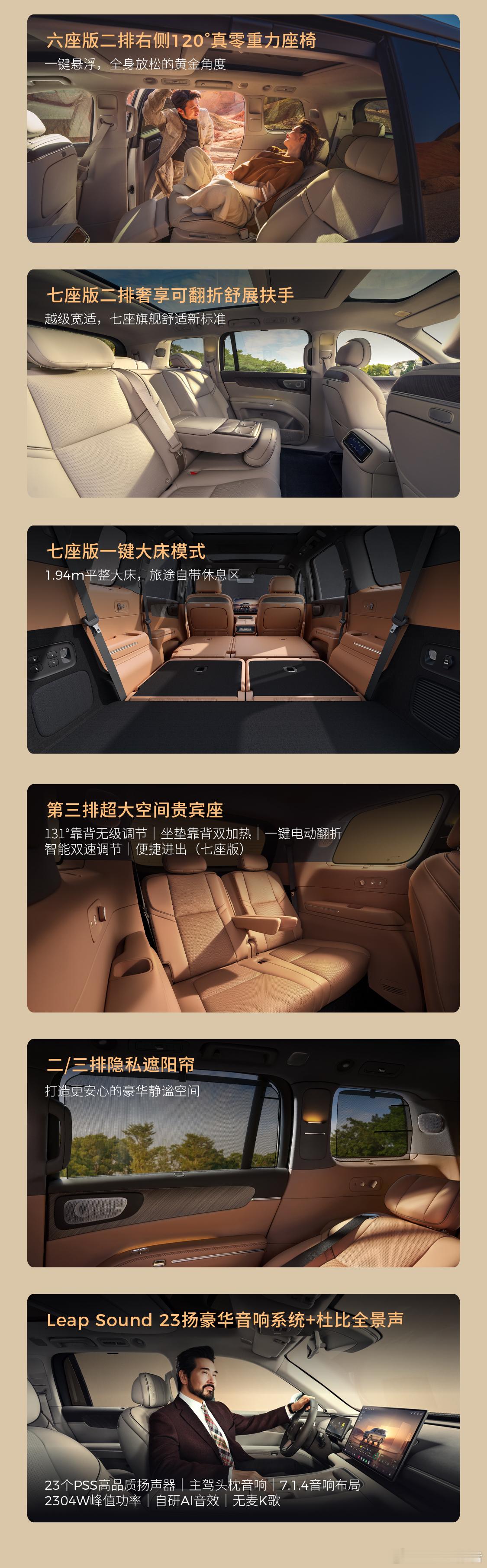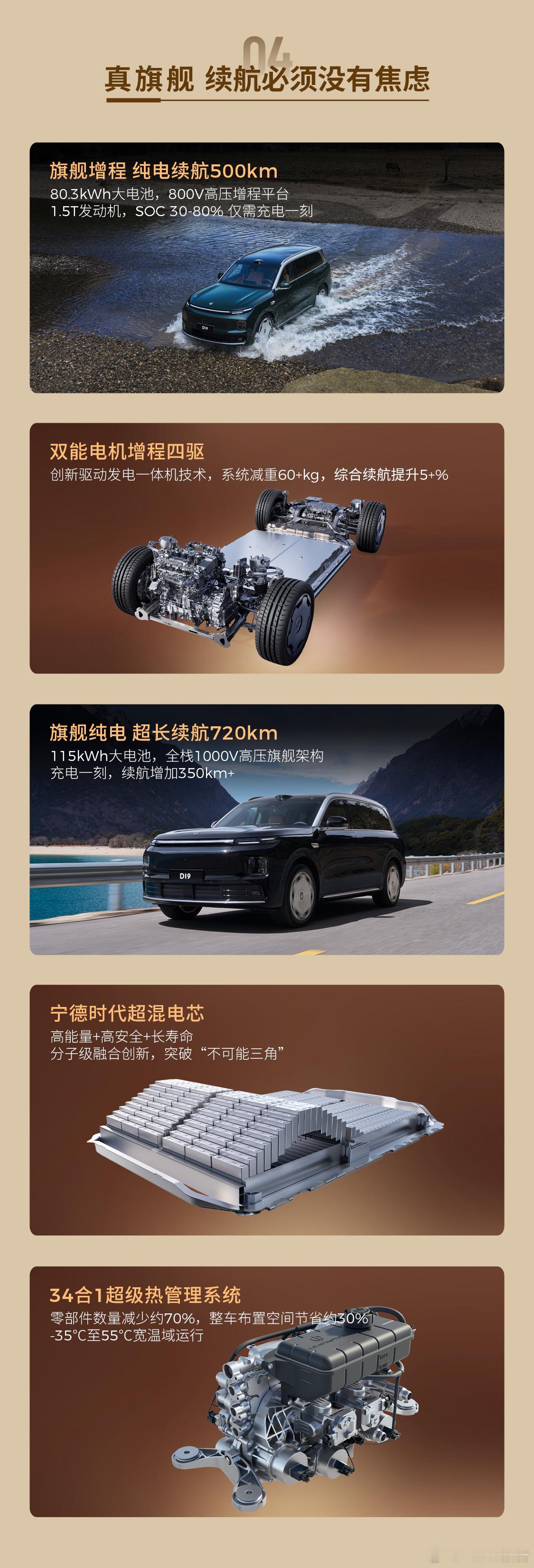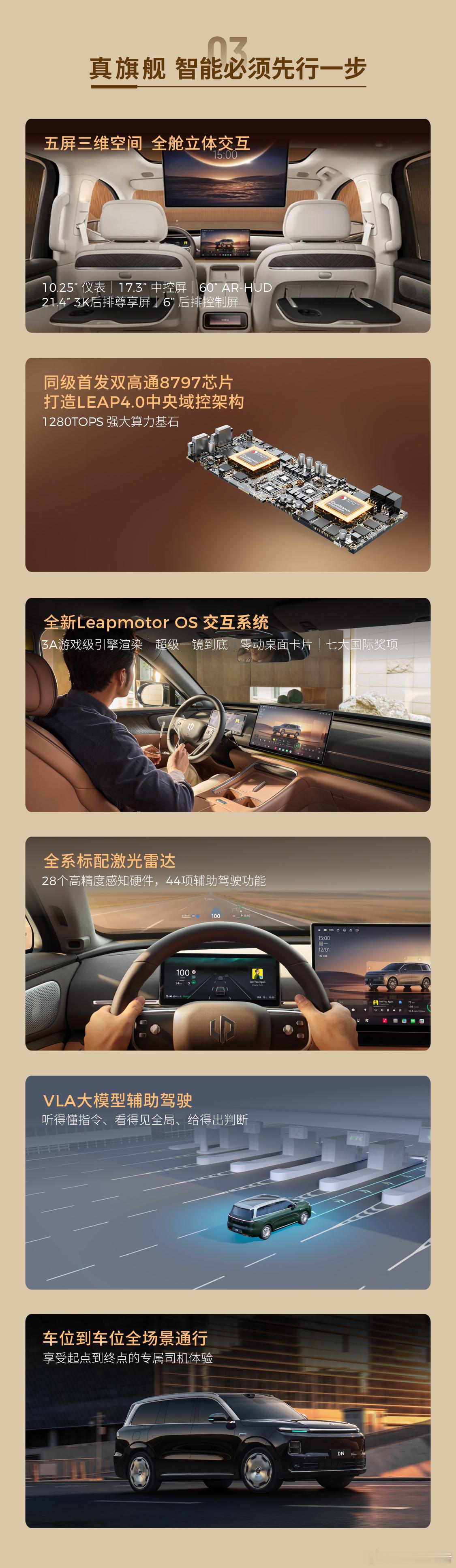 车身尺寸方面,长宽高分别为5252/1995/1800mm,轴距3110mm,提供6/7座布局,五种车漆与三种内饰配色。内饰方面,搭载双高通8797芯片,配备多联屏、AR-HUD、后排娱乐屏与冷暖箱,二排零重力座椅舒适配置拉满。动力提供增程与纯电版:增程版1.5T增程器+80.3kWh电池,纯电续航500km;纯电版115kWh电池,续航720km,搭载1000V高压平台、空悬、氧舱等旗舰配置。零跑D19零跑汽车零跑发布会原来9系旗舰SUV价格也能这么香