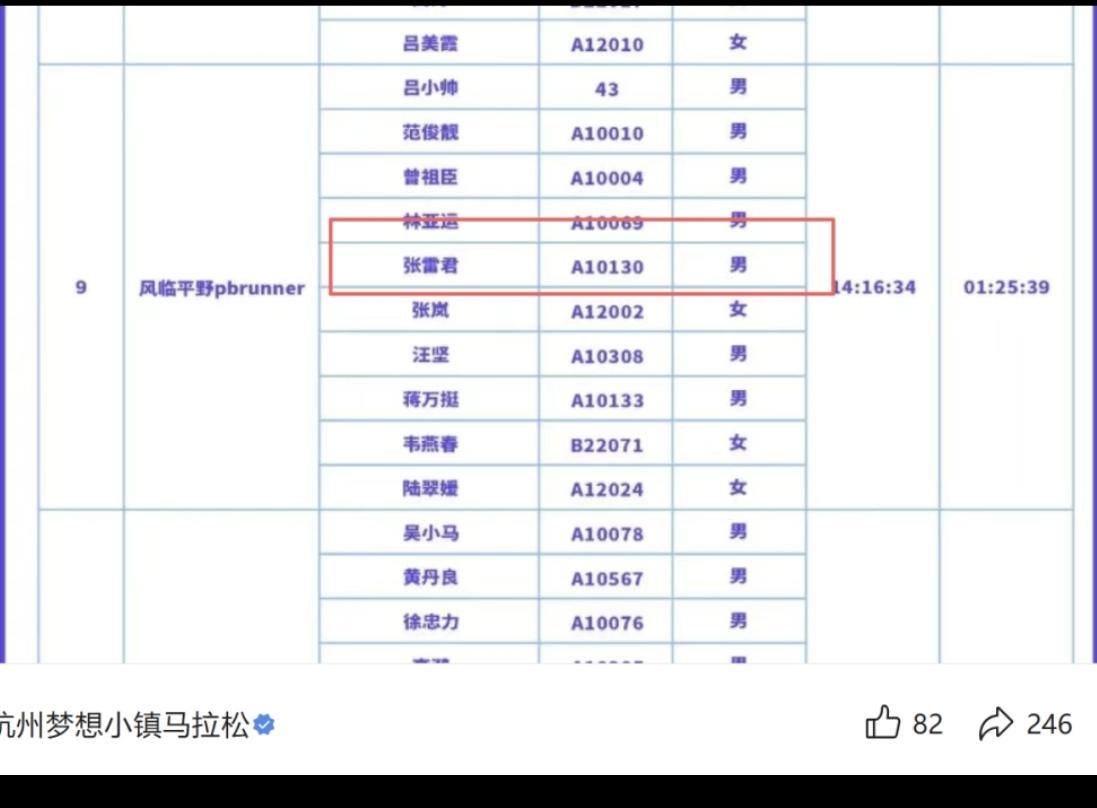 杭州梦想小镇马拉松,选手A10130被查实替跑,不仅个人成绩作废,团队第九名、2000元奖金全部收回,本人禁赛一年,还将上报田协追加处罚。