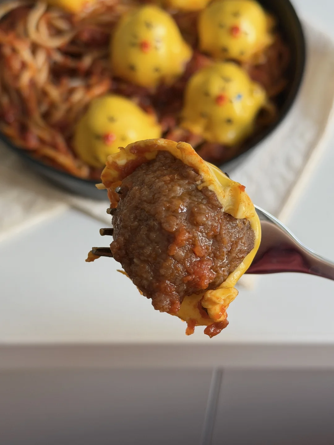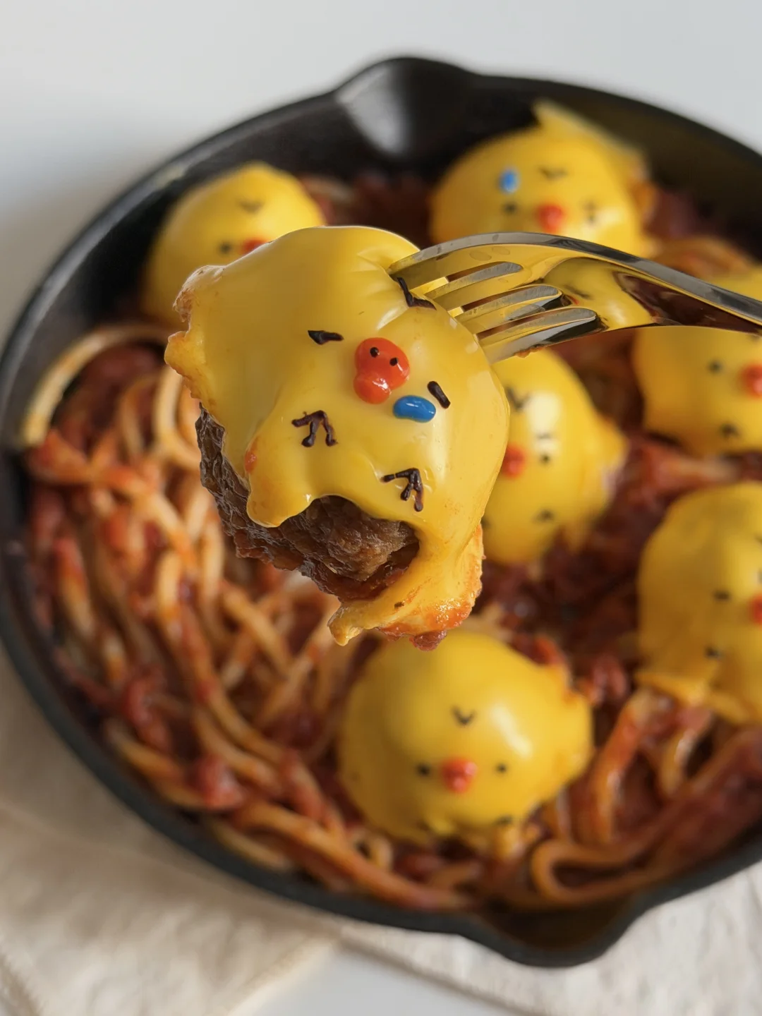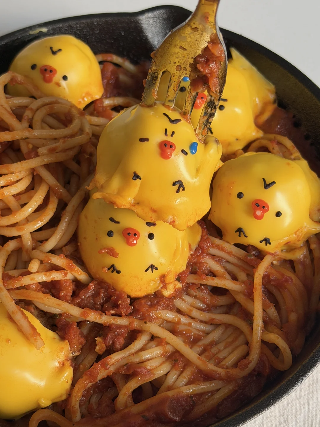 芝士覆盖在肉丸上,融化后用沙拉酱画上鼻孔鸡表情~