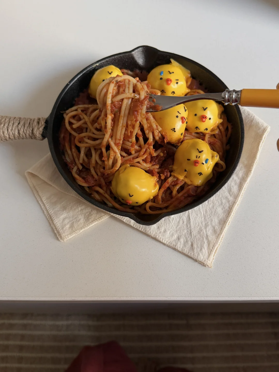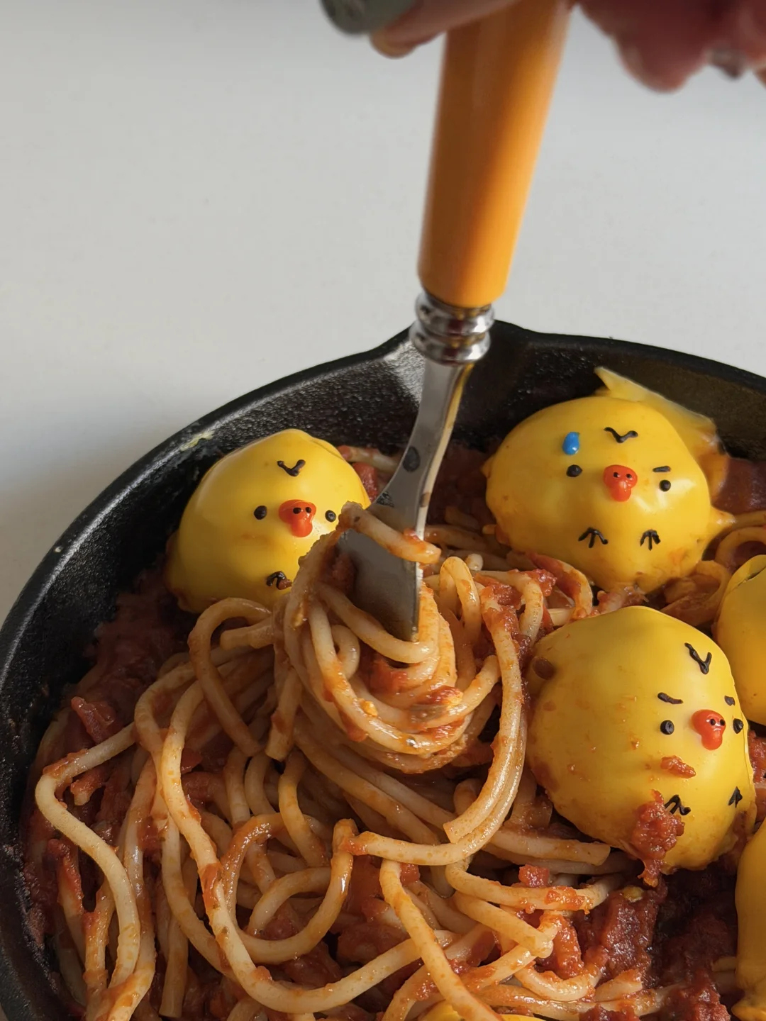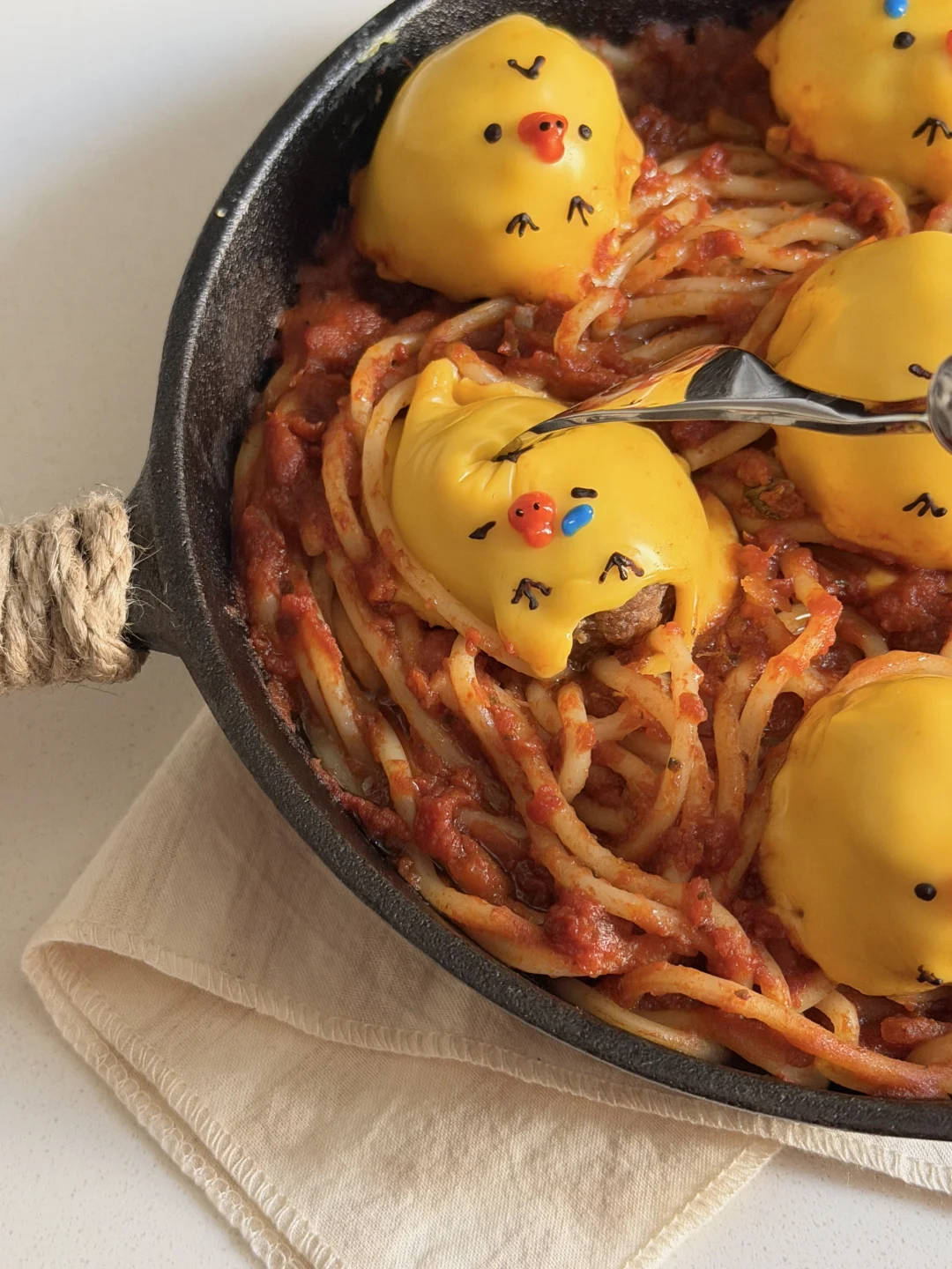 芝士覆盖在肉丸上,融化后用沙拉酱画上鼻孔鸡表情~