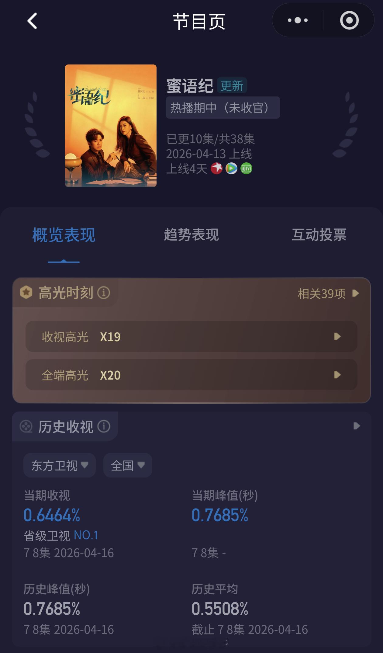 🥭可以布局中偶的,隔壁《蜜语纪》才更新八集,收视率大幅度领先,今晚峰值破0.7