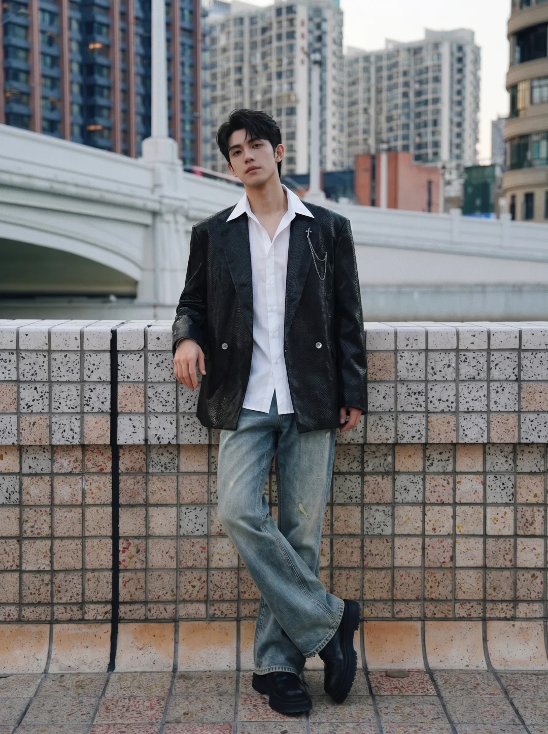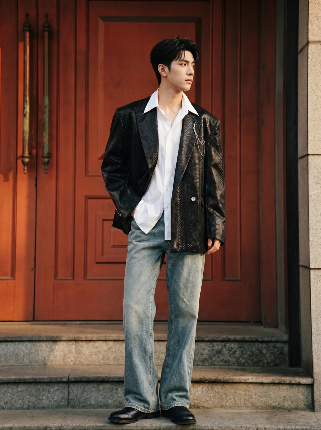 上周穿着它去外滩参加品牌发布会,那种微弱的哑光光泽感,在落日余晖下显得极具质感。这不是那种廉价的皮革,而是甄选了极具纹理感的皮质面料,抗皱性一流,哪怕在车里坐了两个小时,下车依然平整如初,这才是男人的底气。哑光皮纹西服。前胸那一枚精致的链条胸针是灵魂,细节里透着一种精英主义的雅痞感。用牛仔的随性打破西装的严肃,就是现在最流行的“Urban Intellectual”风。别再把自己穿成职场复印件了。这种带点克制、带点疏离感的质感,才是真正的高级。