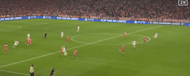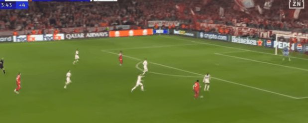 本来拜仁手握2比1的胜利,且有战略优势:他们本可以不用冒险大压出,完全可以控着比赛打。上一战极明白:凯恩压迫吕迪格,格纳布里们协同压迫,迪亚斯对付阿诺德,足以切断皇马后场所有短传路线,迫使皇马频繁大脚丢失球权。拜仁推进到进攻三区时,皇马只能收缩阵型,临时构筑五人防守线。皇马只能防反:抓拜仁整体防线高位前压的漏洞,夺回球权后立刻极速攻防转换,直插拜仁身后。皇马希望防反,然而1比2落后,又必须压出来。