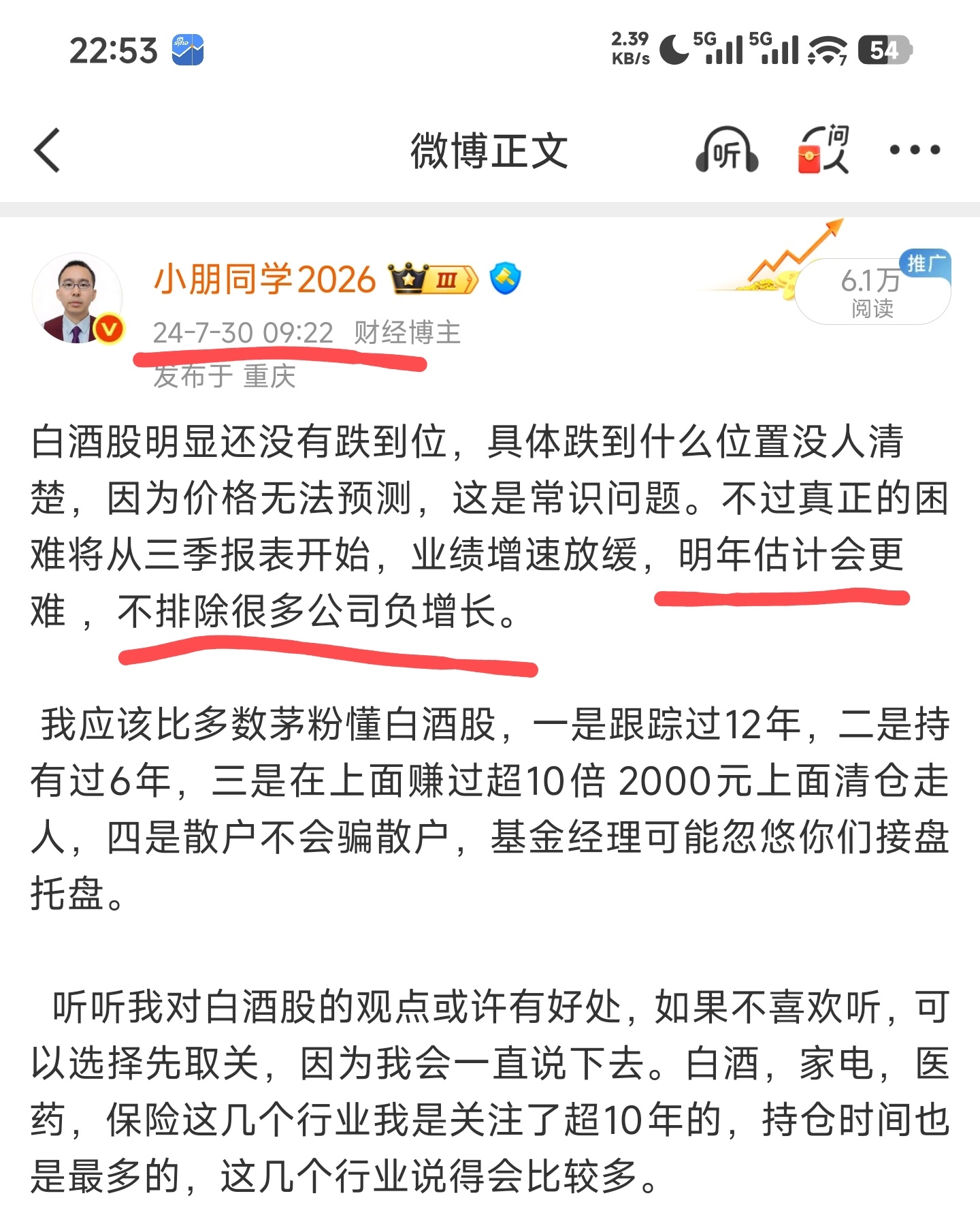 白酒龙头业绩还是负增长了,我对白酒的判断,领先知名基金经理2年以上。