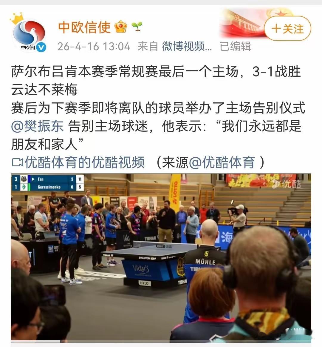樊振东主场告别赛,3:1战胜云达不莱梅,外交部欧洲站转发庆祝!