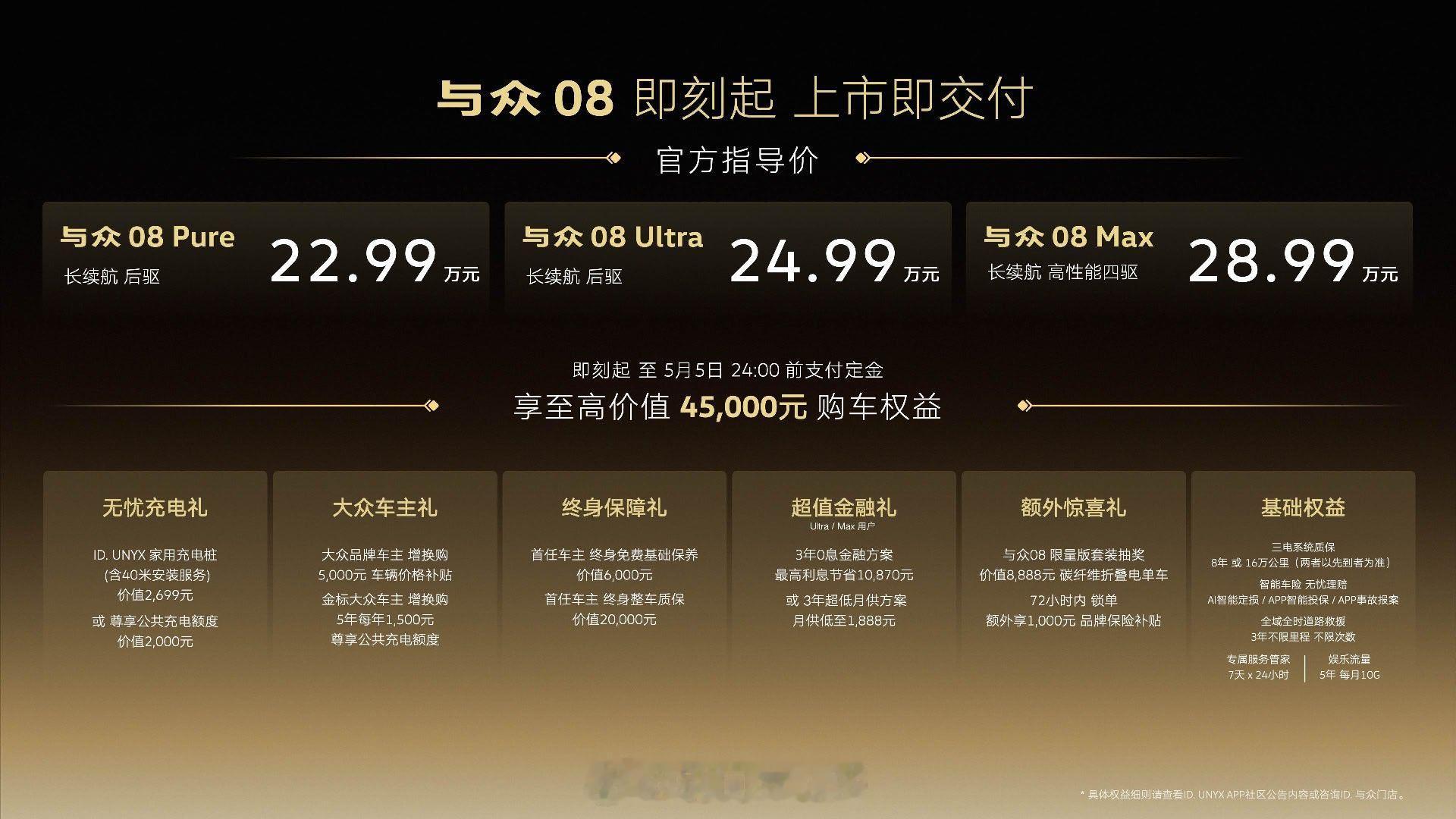 新车推出了Pure、Ultra、Max共3个版本官方指导价为22.99万元-28.99万元作为拥有本土第一梯队智能化水平的全新车型,与众08将“大众人本科技”的理念贯穿于每一处细节,为中国年轻家庭用户带来焕然一新的智能纯电出行体验。