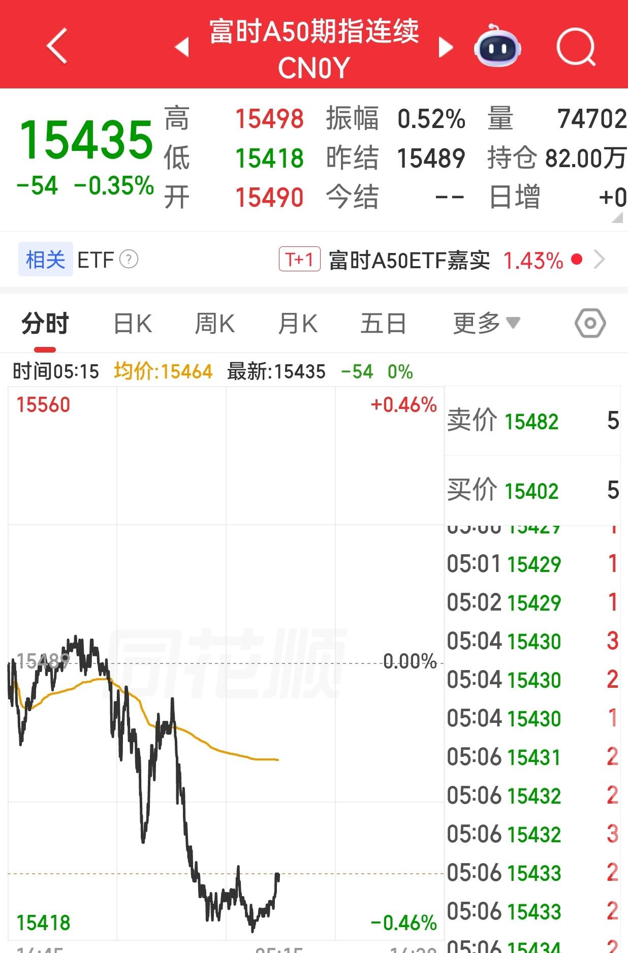 富时A50期指连续夜盘收跌0.35%,报15435点。