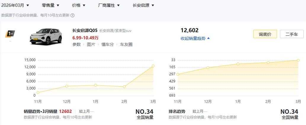 长安启源Q05,自11月上市以来,后面连续三个月销量都在4000辆上下徘徊。到了2026年3月,销量破万,达到了12602辆。