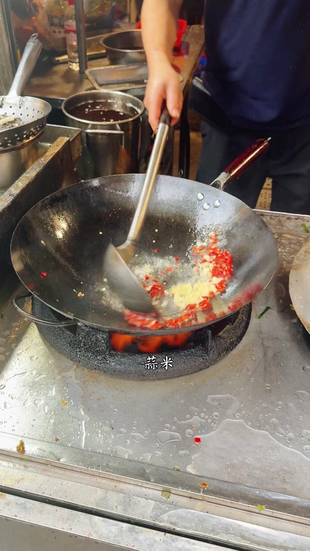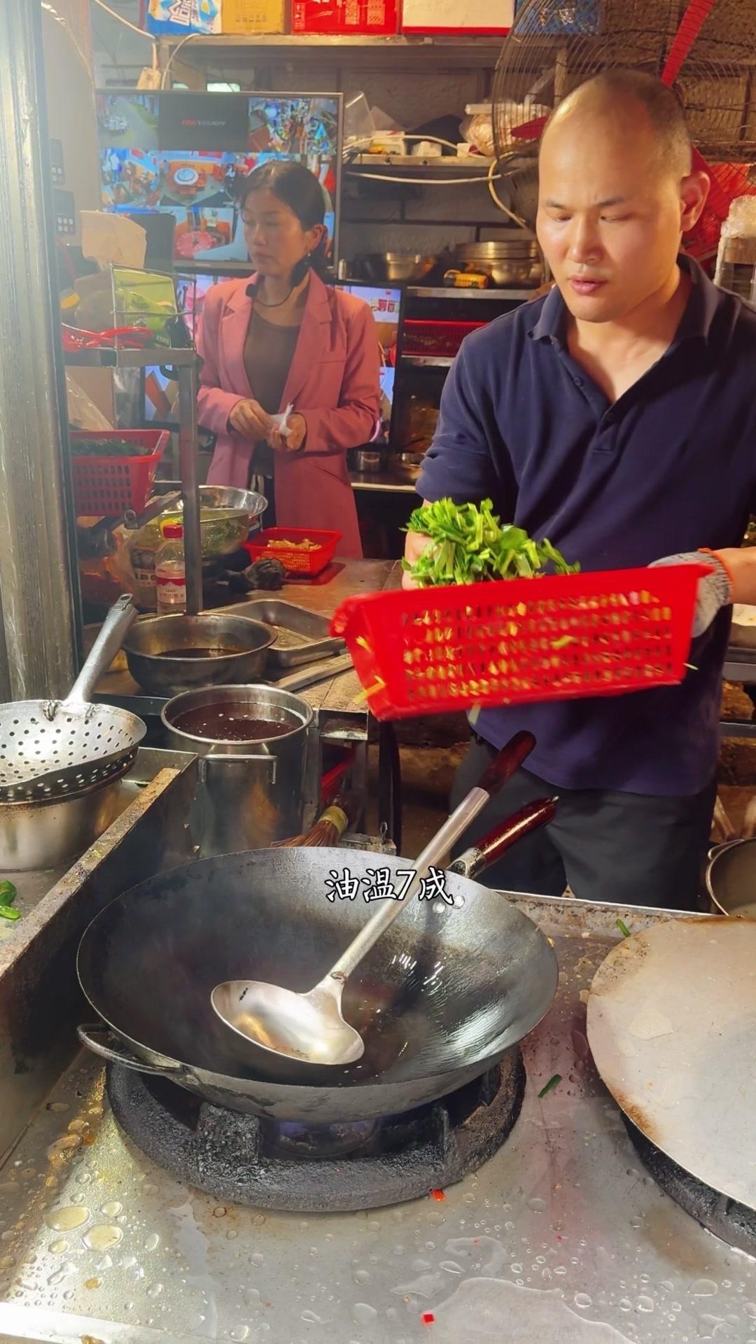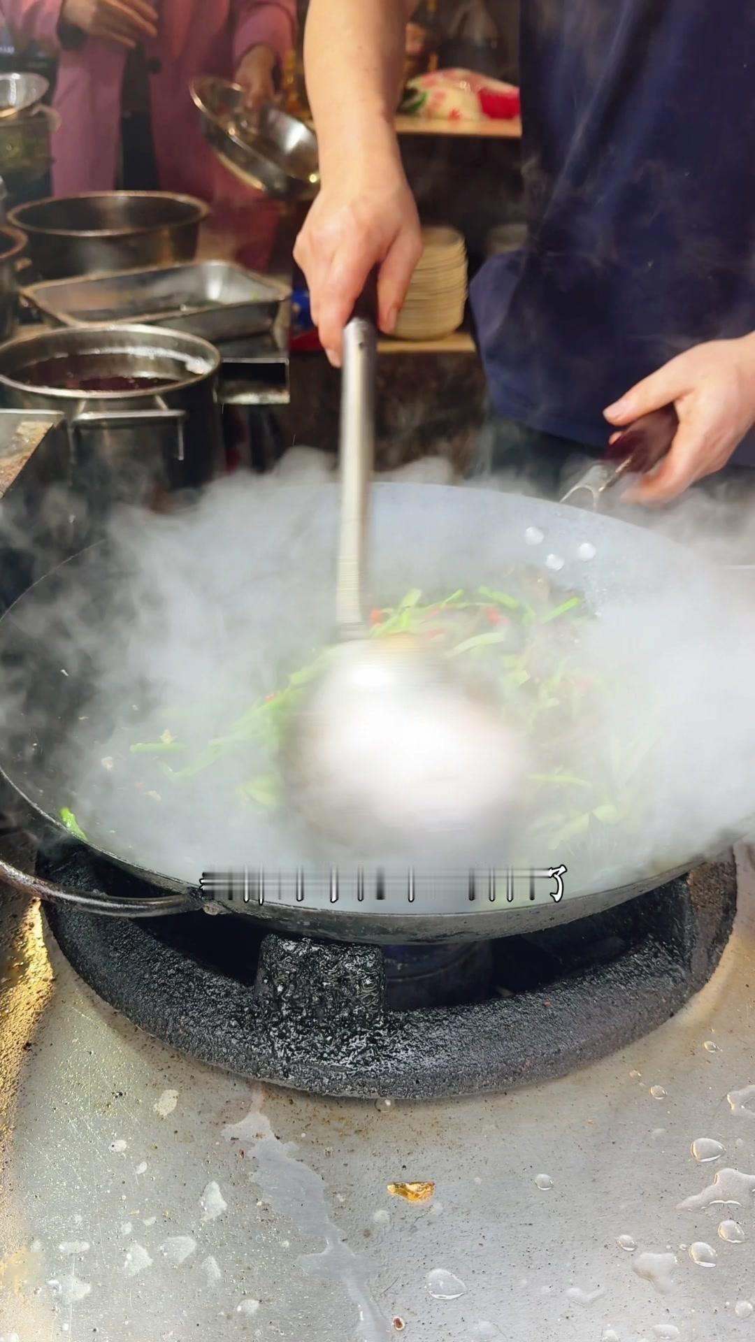 起锅烧猪油,7成油温下空心菜大火翻炒,加蒜子和盐味至变色,倒入少许骨头汤翻炒四五下即可出锅。