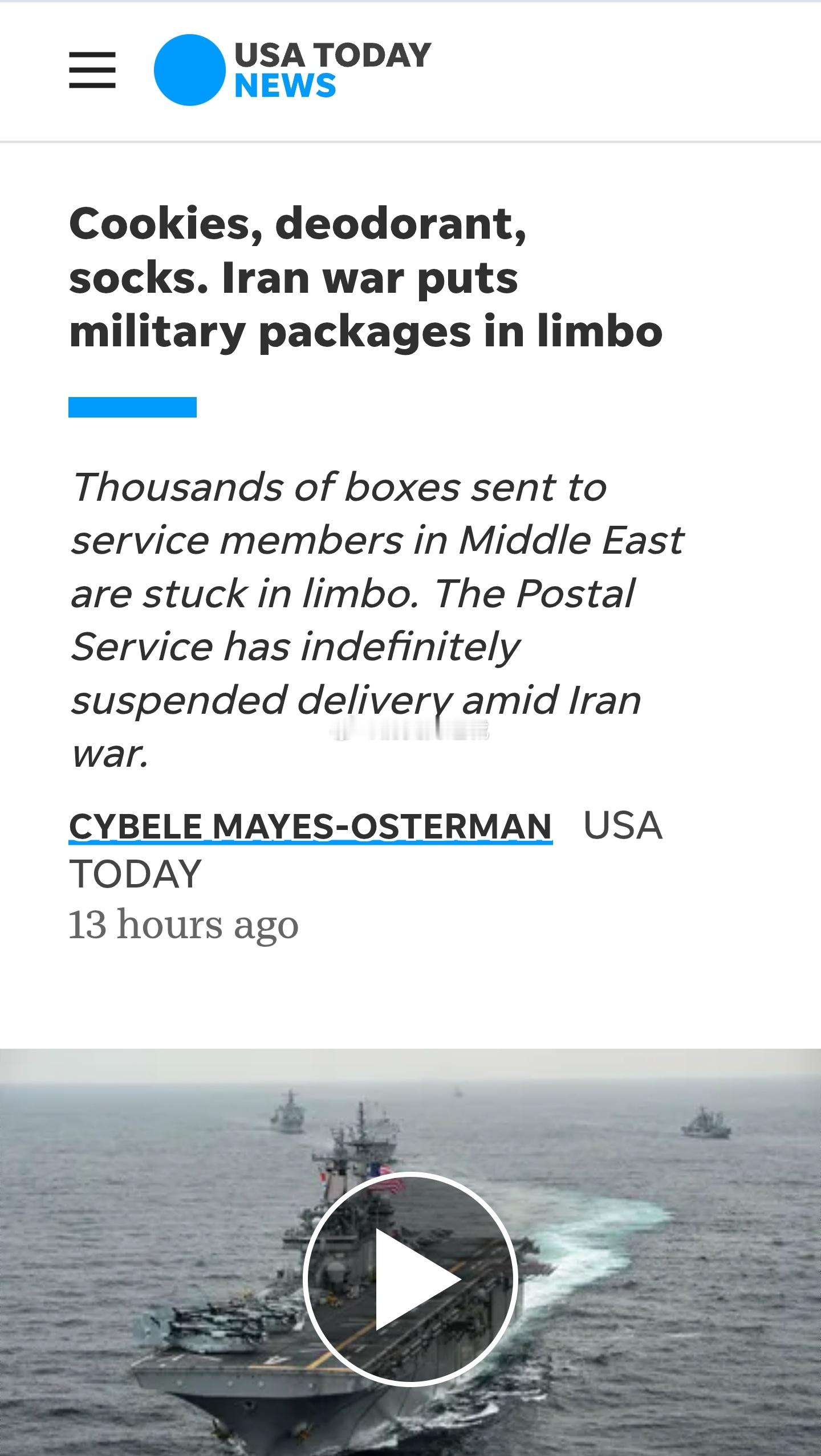 由于行动时间延长且补给线紧张,船员们只能依靠海上有限的补给,导致食物配给制和士气低落。家属表示,水兵们经常挨饿;此外,由于邮件投递中断,家属们也无法向舰上寄送额外的食物或补给品。一名德克萨斯州母亲的儿子是海军水兵,正在 “ 的黎波里号 ” 两栖攻击舰上执行任务。她在得知儿子挨饿后感到恐慌。她的家庭已经花费至少2000美元寄送关怀包裹,但没有一件送达。海外新鲜事