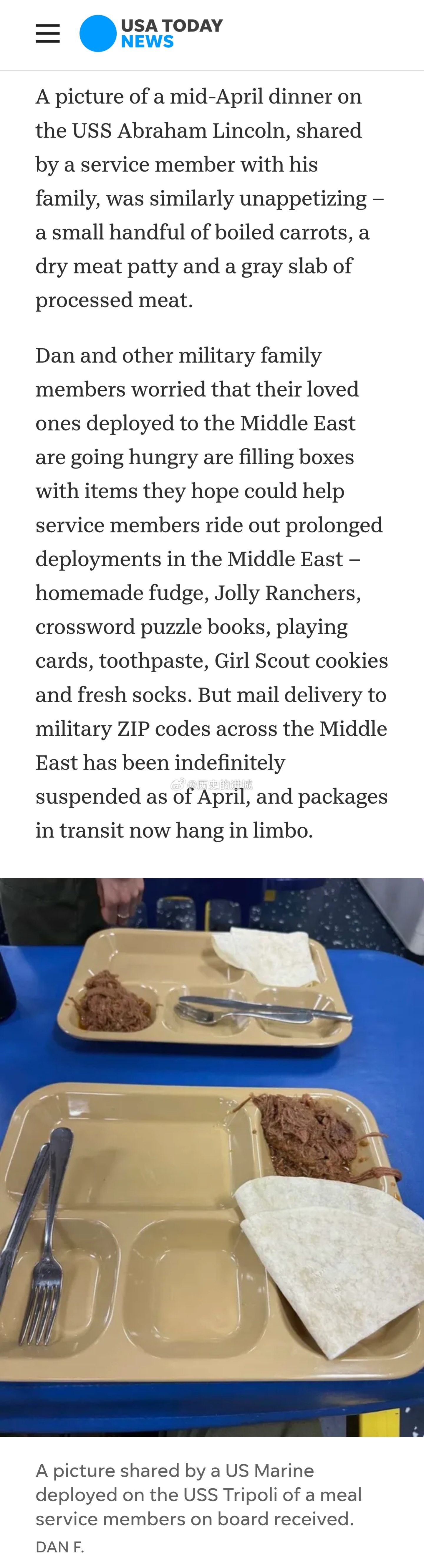 据USA Today报道,美国海军“亚伯拉罕·林肯”号航空母舰上的水兵反映,在伊朗附近海域长期部署期间,食物质量差、分量少。
