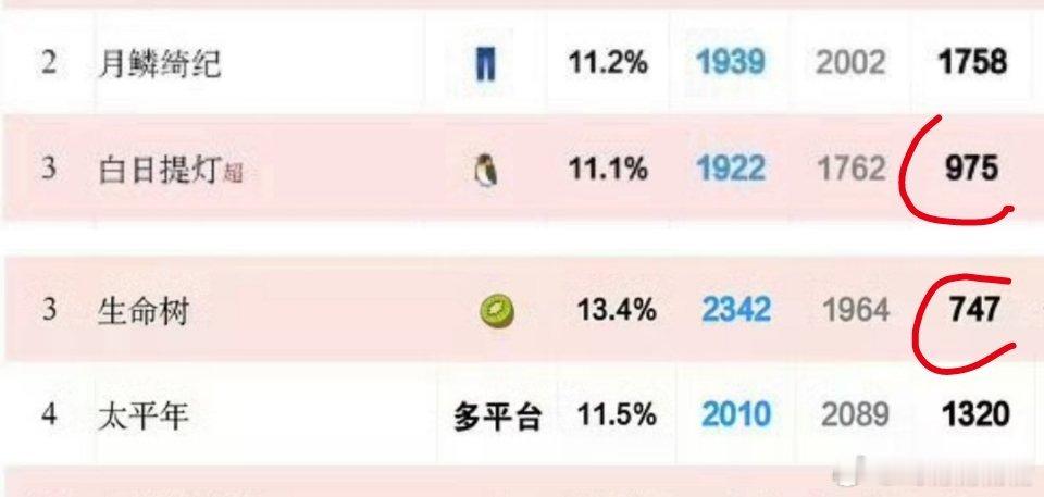 大结局超点,白日提灯云合集均975,生命树集均747,巴紫现在的扛剧能力都不如小花了